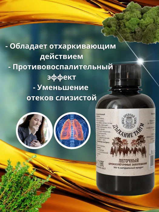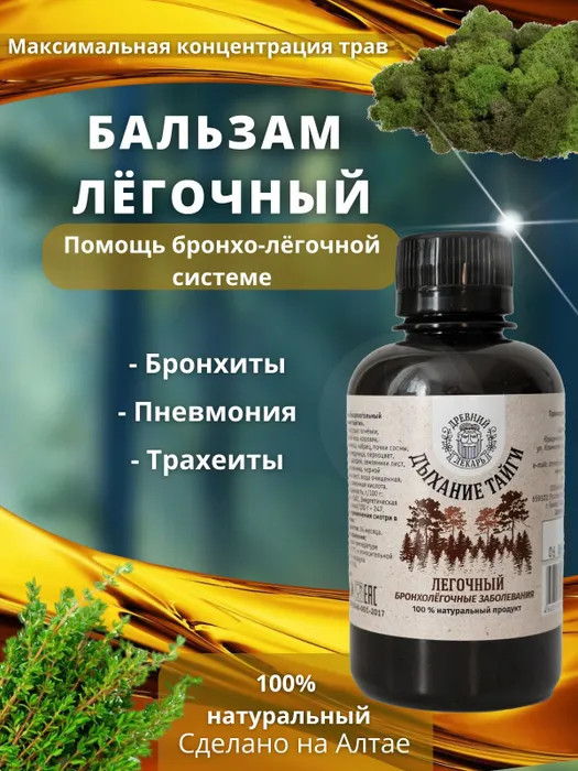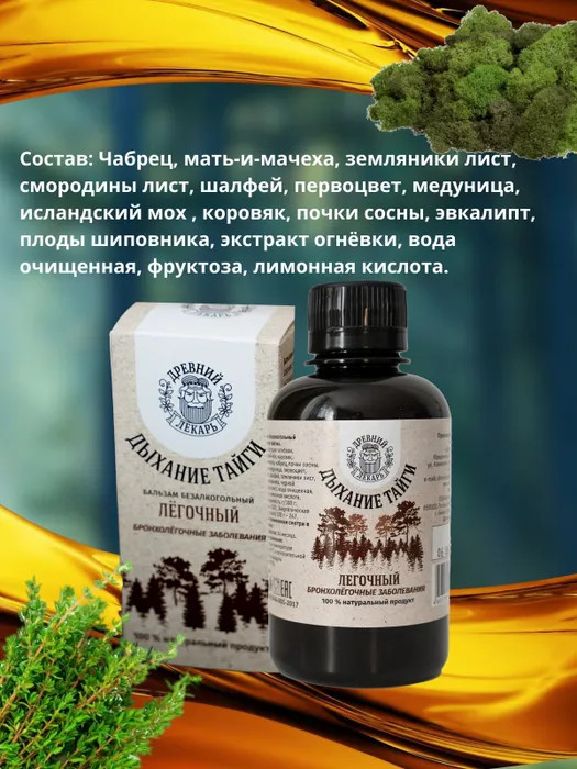 Бальзам соответствует заявленным характеристикам, меня мучает кашель третий месяц(хронический бронхит), особенно по ночам, перепробовала множество разныз таблеток и сиропов от кашля-эффекта никакого! Ну, тут уже все средства хороши,уепляешься буквально за соломинку! Решила поробовать бальзам "дыхание тайги"понравился состав.Начала принимать как указано , стала отходить мокрота, кашель смягчился, стало намного лучше!!!! Заказала вторую упаковку, буду дальше принимать, совету., берите у кого проблемы с бронхами, затяжной кашель, астма, будьте здоровы!
