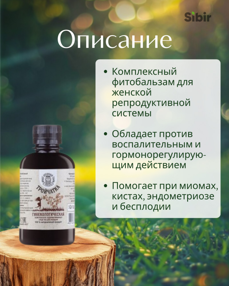 Бальзам «Тройчатка гинекологическая» 🌿 Бальзам обладает противовоспалительным, мочегонным, противоопухолевым, гормонорегулирующим, антимикробным действием. Бальзам применяется при полипозных и кистозных образованиях матки и яичников, эндометриозе, миоме и фибромиоме матки, мастопатии, спаечных процессах яичников и органов малого таза.
