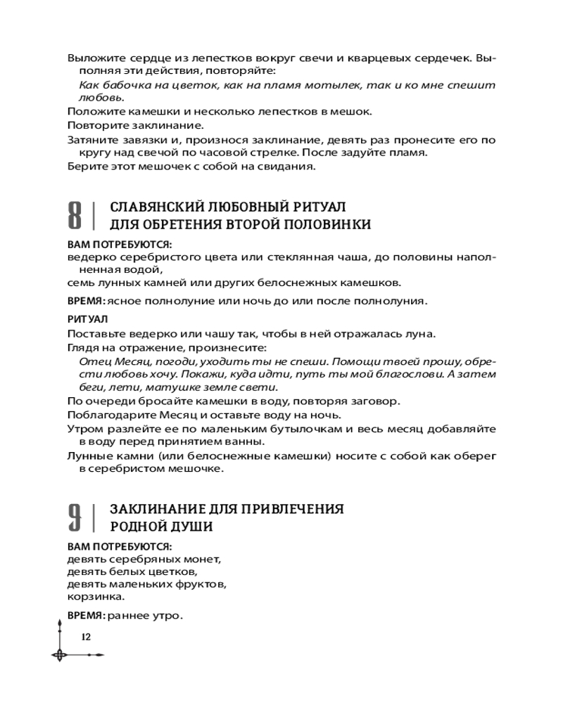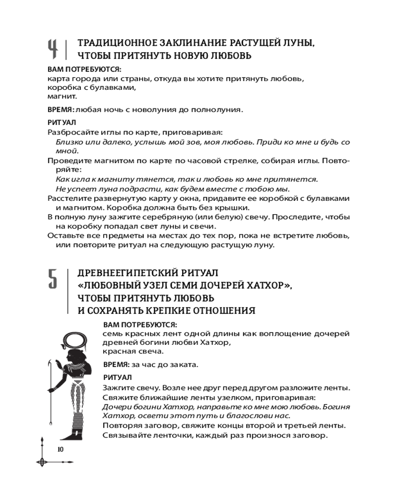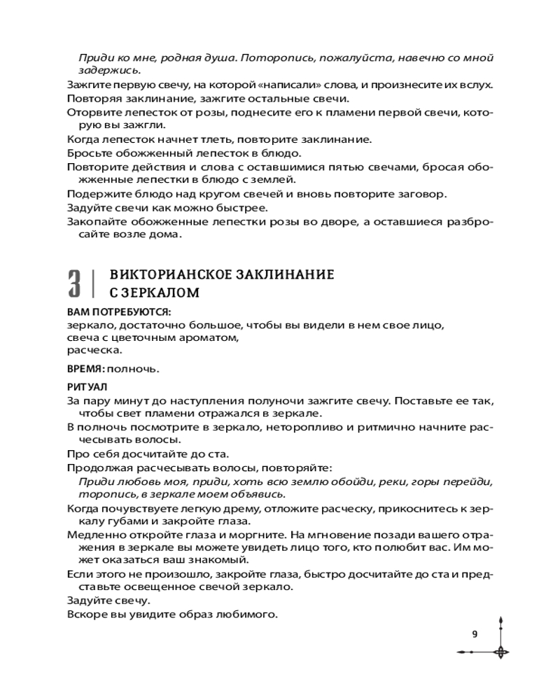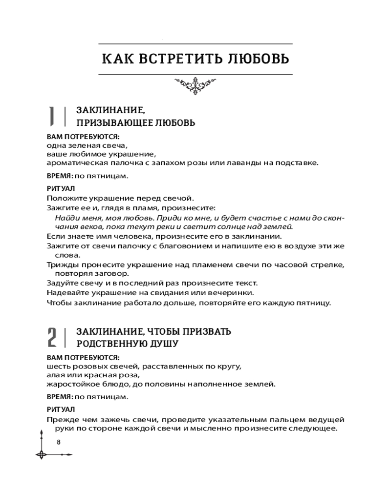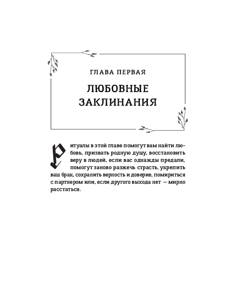 Каждое заклинание подробно описано. Вы узнаете, когда лучше всего исполнять тот или иной ритуал, какие атрибуты использовать, что делать, чтобы заклинание работало как можно дольше, — что ценно и для новичков, и для магов-профессионалов. А большинство ингредиентов для ритуалов вы легко найдете в кухонном шкафчике, саду, супермаркете или в интернете.