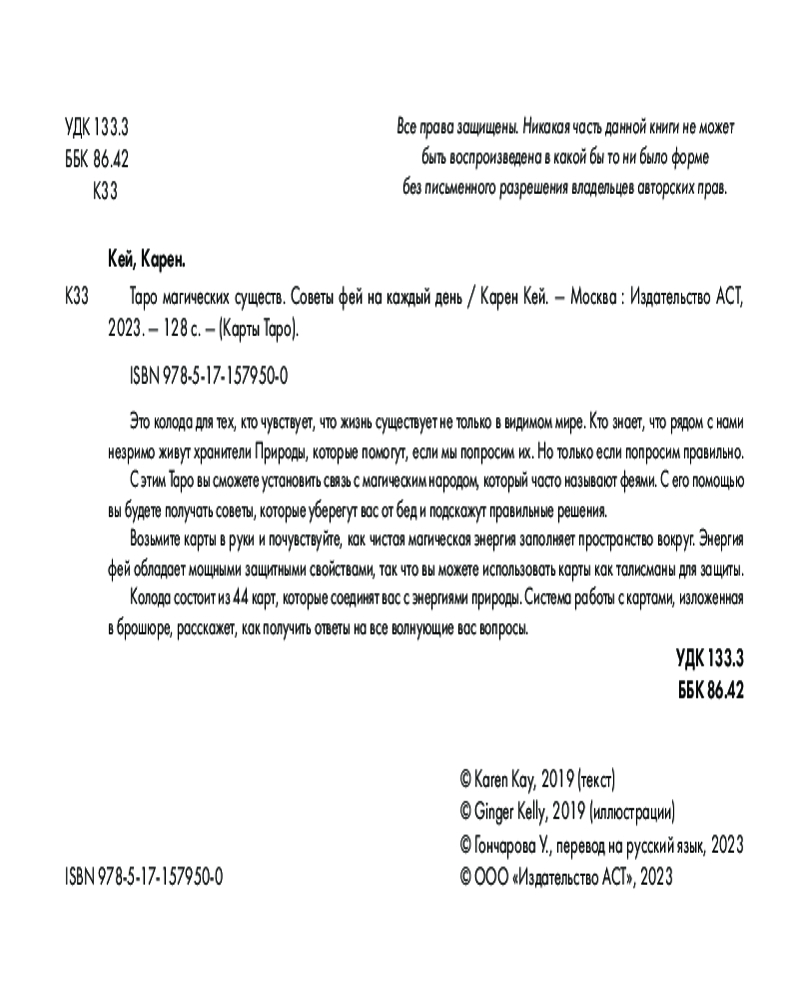 💳 Оплатить за товар можно при получении 🇰🇿 Есть бесплатная доставка по Казахстану от 1 дня 🎁 Копите бонусы с каждой покупки Серия: Карты Таро (Подарочная коробка с картами и книгой) Это колода для тех, кто чувствует, что жизнь существует не только в видимом мире. Кто знает, что рядом с нами незримо живут хранители Природы, которые помогут, если мы попросим их. Но только если попросим правильно. С этим Таро вы сможете установить связь с магическим народом, который часто называют феями. С его помощью вы будете получать советы, которые уберегут вас от бед и подскажут правильные решения. |