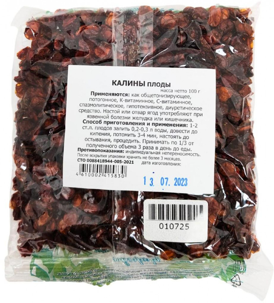 Калину применяют при геморрое, гастритах, колитах и заболеваниях печени, язвенной болезни желудка и двенадцатиперстной кишки, как общеукрепляющее средство, при отеках сердечного и почечного происхождения, гипертонической болезни, как потогонное при простуде, кашле, при судорогах, истерии, бессоннице, излишней раздражительности. Наружно применяют в виде примочек и компрессов при кожных заболеваниях (фурункулезе, кожных сыпях и лишаях) и носовых кровотечениях (тампоны).