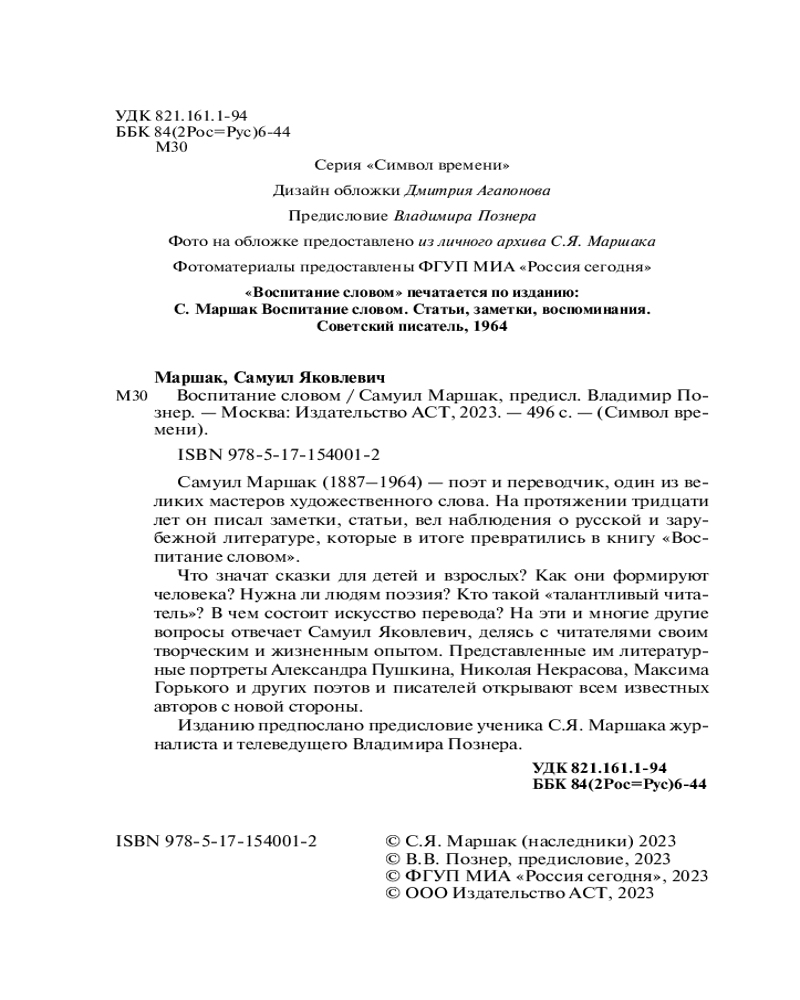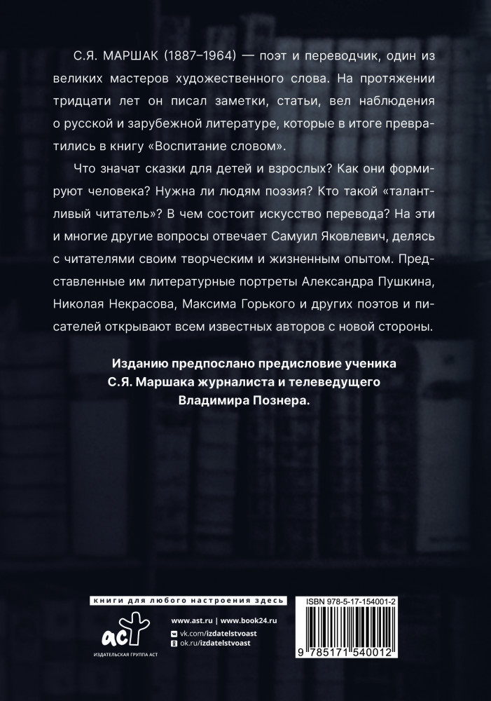 💳 Оплатить за товар можно при получении 🇰🇿 Есть бесплатная доставка по Казахстану от 1 дня 🎁 Копите бонусы с каждой покупки Серия: Символ времени Самуил Яковлевич Маршак (1887-1964) — поэт и переводчик, один из великих мастеров художественного слова. На протяжении тридцати лет он писал заметки, статьи, вел наблюдения о русской и зарубежной литературе, которые в итоге превратились в книгу «Воспитание словом». |