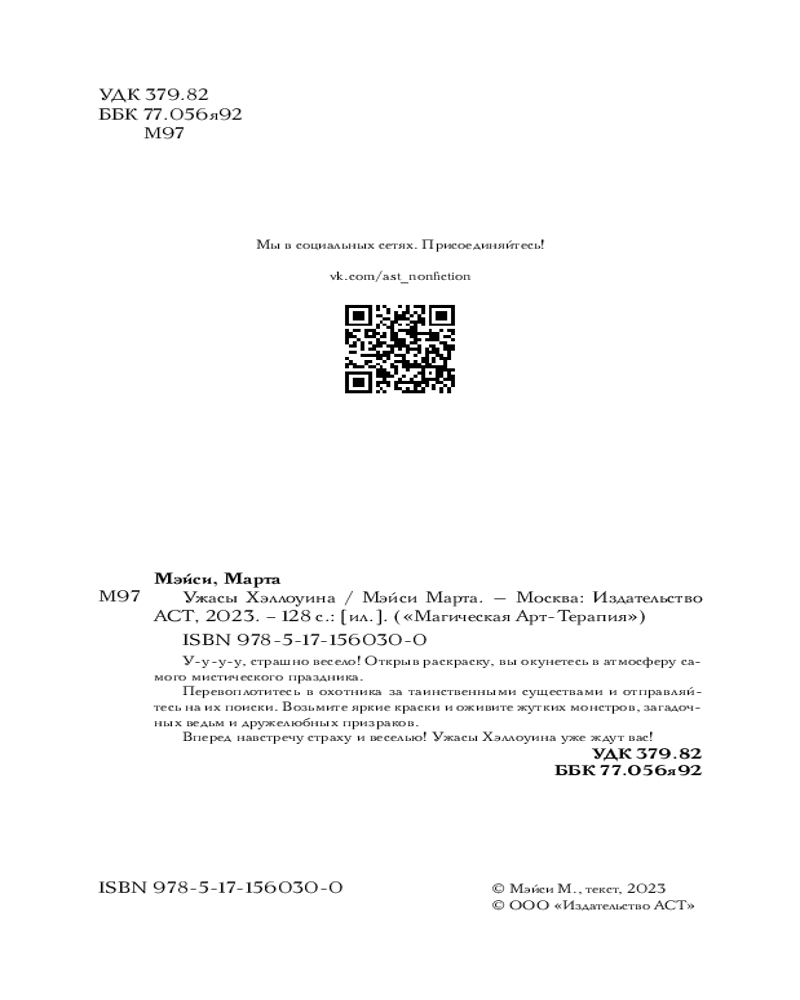 💳 Оплатить за товар можно при получении 🇰🇿 Есть бесплатная доставка по Казахстану от 1 дня 🎁 Копите бонусы с каждой покупки Серия: Магическая Арт-Терапия У-у-у-у, страшно весело! Открыв раскраску, вы окунетесь в атмосферу самого мистического праздника. Перевоплотитесь в охотника за таинственными существами и отправляйтесь на их поиски. Возьмите яркие краски и оживите жутких монстров, загадочных ведьм и дружелюбных призраков. Вперед навстречу страху и веселью! Ужасы Хеллоуина уже ждут вас! |