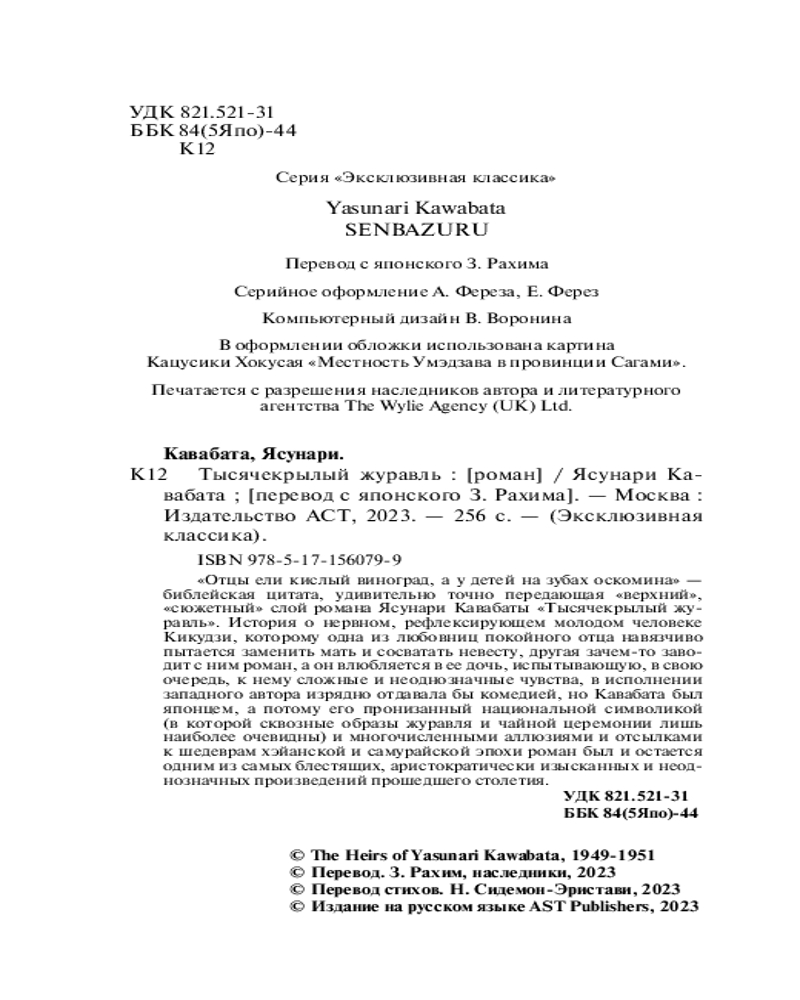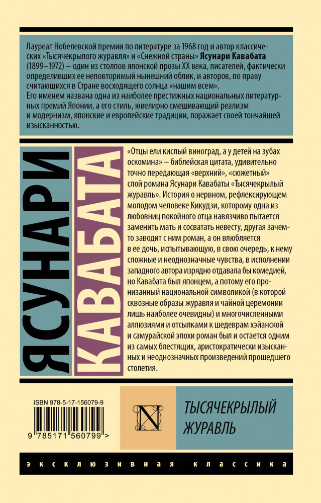 💳 Оплатить за товар можно при получении 🇰🇿 Есть бесплатная доставка по Казахстану от 1 дня 🎁 Копите бонусы с каждой покупки Серия: Эксклюзивная классика «Отцы ели кислый виноград, а у детей на зубах оскомина» — библейская цитата, удивительно точно передающая «верхний», «сюжетный» слой романа Ясунари Кавабаты «Тысячекрылый журавль». |