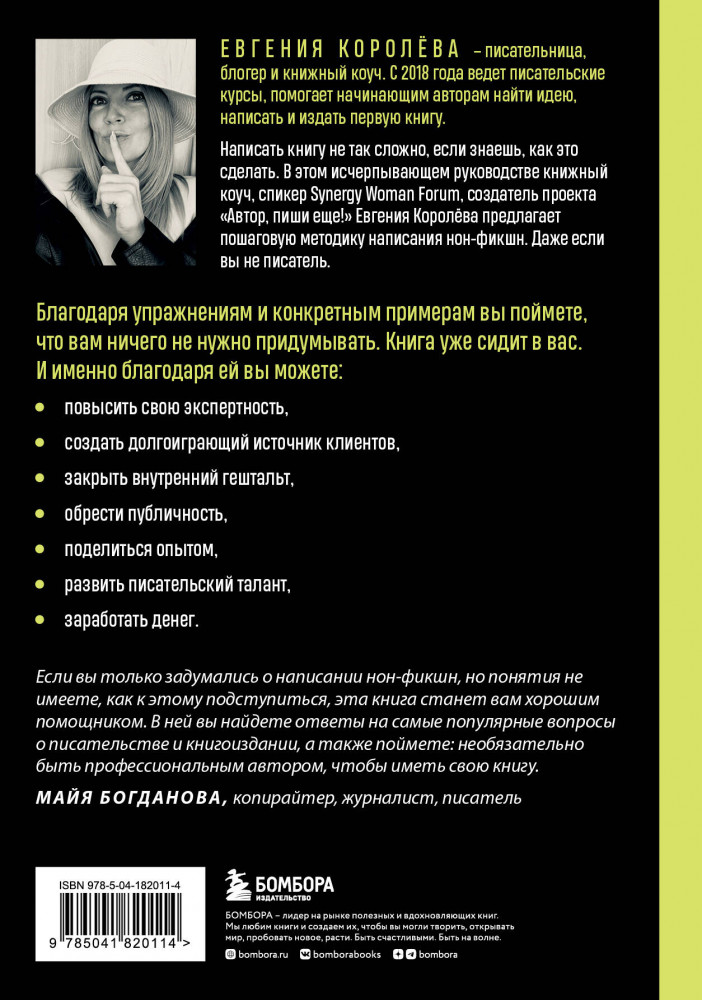 Как написать книгу, если ты не писательВ данный момент этот товар отсутствует в продаже. Возможно, у нас найдется аналогичный или похожий товар здесь. Серия: TEXT UP. Копирайтинг нового уровня Написать книгу не так сложно, если знаешь, как это сделать. В этом исчерпывающем руководстве книжный коуч, спикер Synergy Woman Forum, создатель проекта «Автор, пиши еще!» Евгения Королева, предлагает пошаговую методику написания нон-фикшен. Даже если вы не писатель. |