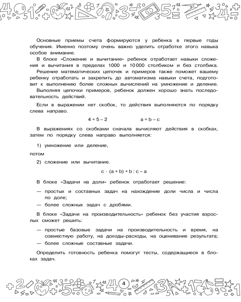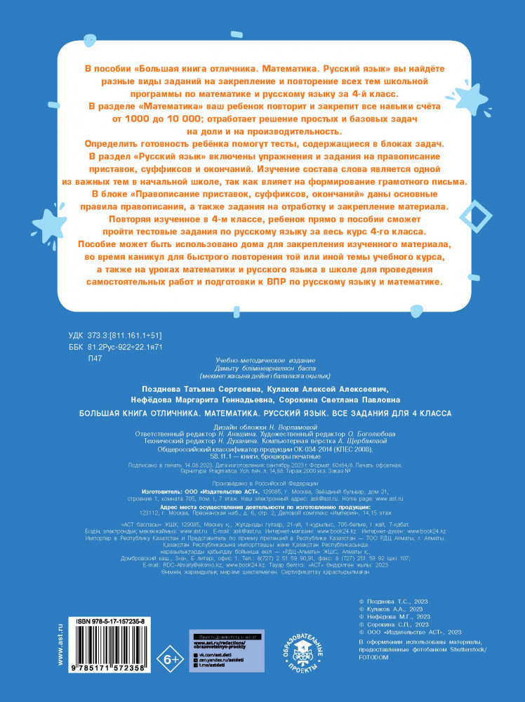 💳 Оплатить за товар можно при получении 🇰🇿 Есть бесплатная доставка по Казахстану от 1 дня 🎁 Копите бонусы с каждой покупки Серия: Тренажерный класс В пособии «Большая книга отличника. Математика. Русский язык» вы найдёте разные виды заданий на закрепление и повторение всех тем школьной программы по математике и русскому языку за 4-й класс. |