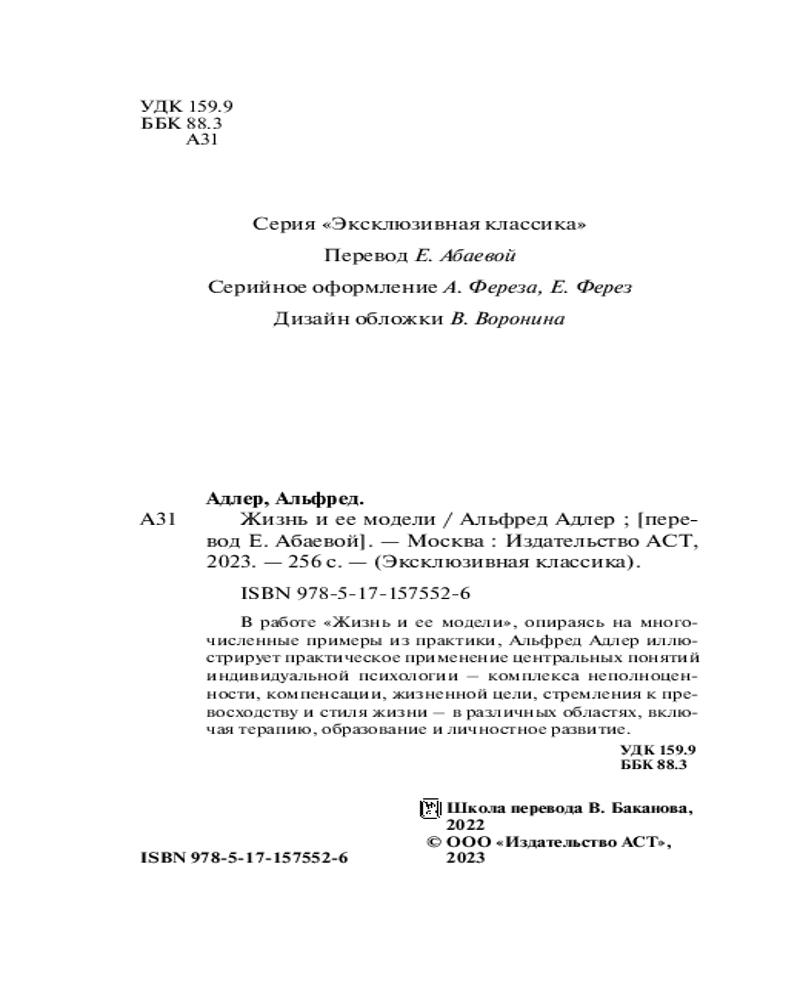 💳 Оплатить за товар можно при получении 🇰🇿 Есть бесплатная доставка по Казахстану от 1 дня 🎁 Копите бонусы с каждой покупки Серия: Эксклюзивная классика В работе «Жизнь и ее модели», опираясь на многочисленные примеры из практики, Альфред Адлер иллюстрирует практическое применение центральных понятий индивидуальной психологии — комплекса неполноценности, компенсации, жизненной цели, стремления к превосходству и стиля жизни — в различных областях, включая терапию, образование и личностное развитие. |