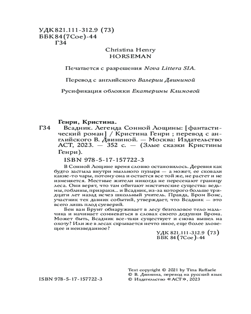 💳 Оплатить за товар можно при получении 🇰🇿 Есть бесплатная доставка по Казахстану от 1 дня 🎁 Копите бонусы с каждой покупки Серия: Злые сказки Кристины Генри В Сонной Лощине время словно остановилось. Деревня как будто застыла внутри мыльного пузыря — а может, ее сковали какие-то чары, потому она и остается все той же, не растет и не изменяется. Местные жители никогда не пересекают границу леса. Они верят, что там обитают мистические существа: ведь мы, гоблины, призраки... и Всадник, из-за которого больше тридцати лет назад исчез школьный учитель. Правда, Бром Бонс, участник тех давних событий, утверждает, что Всадник — это всего лишь плод суеверий. |