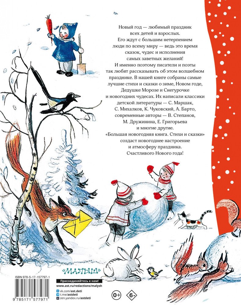 Большая новогодняя книга. Стихи и сказкиВ данный момент этот товар отсутствует в продаже. Возможно, у нас найдется аналогичный или похожий товар здесь. Серия: Чудесный Новый год В сборник вошли самые лучшие стихи и сказки о волшебном празднике Новом годе, зиме, Дедушке Морозе, Снегурочке и новогодних чудесах. Произведения сборника написали такие признанные классики детской книги, как С. Маршак, С. Михалков, К. Чуковский, А. Барто, а также современные авторы — В. Степанов, М. Дружинина, Е. Григорьева и многие другие. Из книги ребята узнают, куда идёт снег, во что превращается снежный медведь и кто такая Злка. А ещё прочитают о том, как отмечают Новый год в Простоквашино, почему грустит Дед Мороз и что нарисовано на снежной странице. |