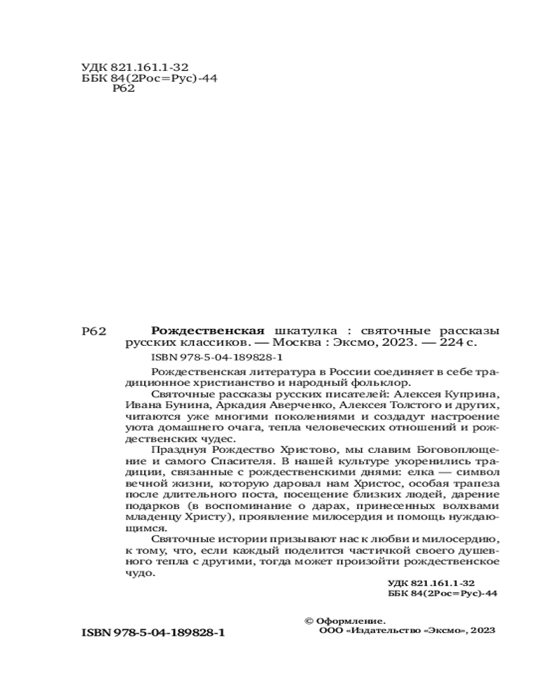 «Рождественская шкатулка» — сборник святочных рассказов, в котором собраны произведения величайших отечественных писателей: Иван Бунин, Алексей Толстой, Леонид Андреев, Иван Шмелев, Аркадий Аверченко и многие другие. Читая рассказы великих классиков, вы вспомните о милосердии, помощи близким и почему этот праздник так важен. Подарите себе и близким праздничную атмосферу Рождества с помощью «Рождественской шкатулки» рассказов! |