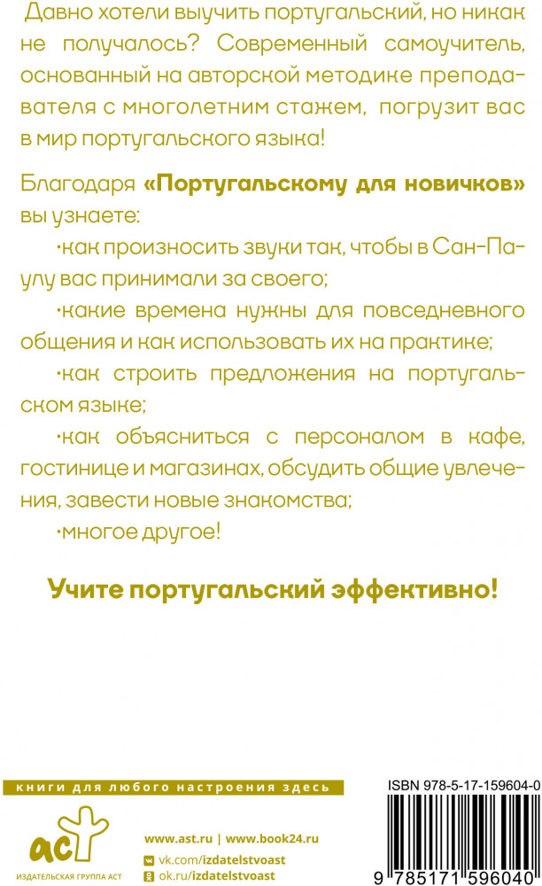 💳 Оплатить за товар можно при получении 🇰🇿 Есть бесплатная доставка по Казахстану от 1 дня 🎁 Копите бонусы с каждой покупки Серия: Языковой старт Данный самоучитель поможет читателям самостоятельно без помощи преподавателя овладеть азами бразильского варианта португальского языка. Здесь вы найдете основные правила чтения и произношения, самые нужные грамматические темы, а также тексты для чтения. Материал в пособии изложен максимально понятно и доступно, хорошо запоминается благодаря большому количеству наглядных таблиц и примеров с общеупотребительной лексикой. |