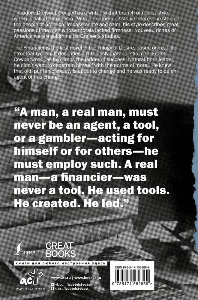 В данный момент этот товар отсутствует в продаже. Возможно, у нас найдется аналогичный или похожий товар здесь. Серия: Great Books Роман «Финансист» американского писателя Теодора Драйзера — это история жизни Фрэнка Каупервуда, молодого и амбициозного бизнесмена, который стремится к богатству и власти. Он использует свои финансовые знания и связи, не слишком заботясь о принципах морали, чтобы заработать деньги и построить свою империю.