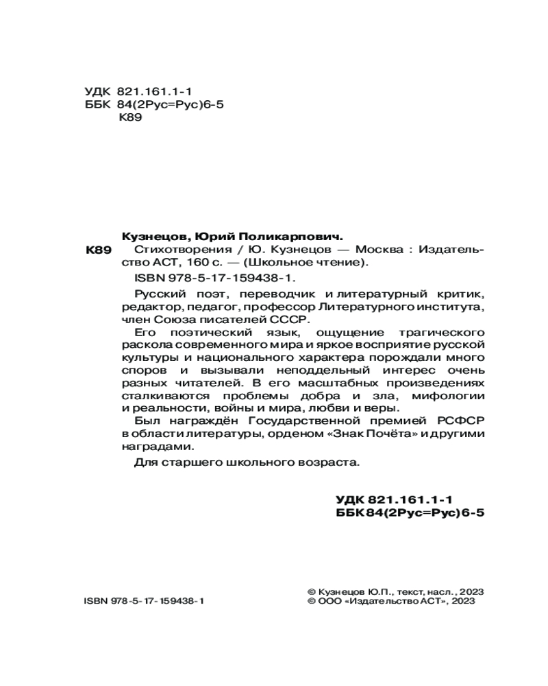 💳 Оплатить за товар можно при получении 🇰🇿 Есть бесплатная доставка по Казахстану от 1 дня 🎁 Копите бонусы с каждой покупки Серия: Школьное чтение Юрий Поликарпович Кузнецов (1941-2003) — русский поэт, переводчик и литературный критик, редактор, педагог, профессор Литературного института, член Союза писателей СССР. |