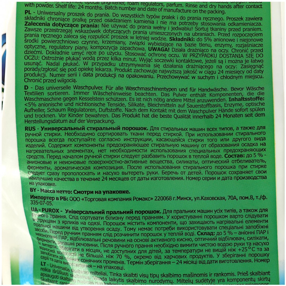 | Универсальные порошки и гели для стирки марки Purox это эффективные стиральные средства для светлых и цветных вещей для всех видов стиральных машин и для ручной стирки. Для ежедневного применения при малых и средних загрязнениях. Дополнительно порошки защищают стиральные машины от осаждения налёта, продлевая тем самым их службу. Не содержат цеолитов и фосфатов. |