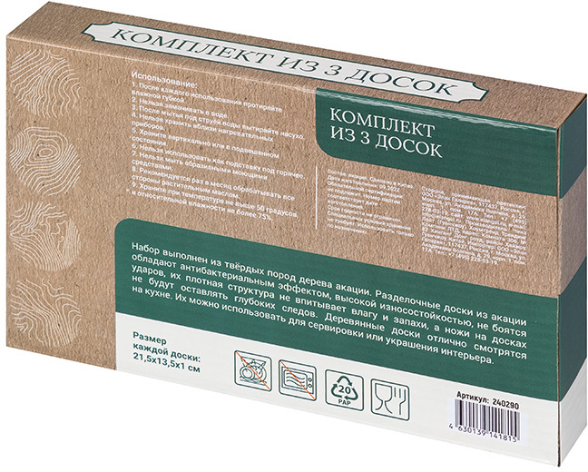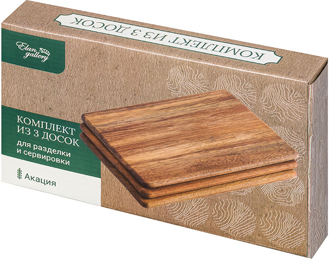 Elan Gallery Комплект из досок для разделки и сервировкиВ данный момент этот товар отсутствует в продаже. Возможно, у нас найдется аналогичный или похожий товар здесь. Комплект состоит из 3-х досок для разделки и сервировки. Каждая доска изготовлена из дерева акации, имеет прямоугольную форму. Дерево акации славится своей прочностью и естественной красотой, что делает нашу доску не только удобным инструментом на кухне, но и стильным элементом декора. При изготовлении набора досок использованы экологически чистые материалы, чтобы обеспечить абсолютную безопасность при работе с пищей. Деревянная доска станет удобным помощником в резке хлеба, сыра, мяса, рыбы, грибов, овощей и фруктов. |