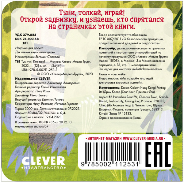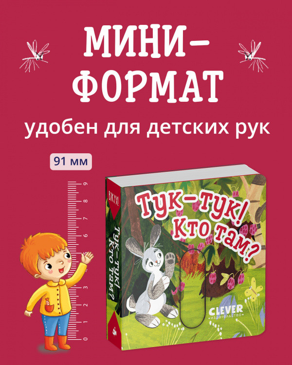 Вжух! Тук-тук! Кто там?В данный момент этот товар отсутствует в продаже. Возможно, у нас найдется аналогичный или похожий товар здесь. Серия: Вжух! «Вжух! Тук-тук! Кто там?» — это миниатюрная книжка-игрушка, созданная специально для маленьких детских ручек. Плотные картонные странички выдержат даже самый активный детский интерес, а яркие картинки, задания и игра с открыванием створок познакомят ребенка с разными животными. |