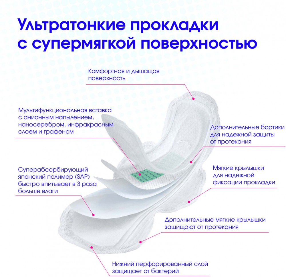 Премиальная линейка гигиенических прокладок LinYun обеспечивает идеальный комфорт и защиту в критические дни. Благодаря дышащей поверхности и суперпитывающему японскому адсорбенту (SAP) прокладки поглощают в 3 раза больше влаги и удерживают её внутри, а дополнительные крылышки по всей длине и система фиксации надёжно защищают от протекания. Нижняя поверхность прокладок также имеет дышащий слой, который препятствует размножению бактерий и развитию раздражения в интимной зоне.