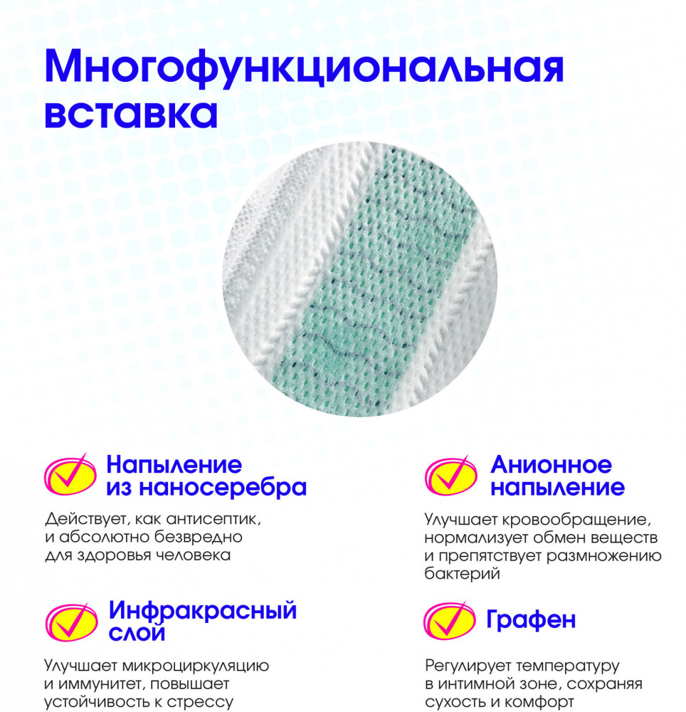 • графен — регулирует температуру в интимной зоне, сохраняя сухость и комфорт.