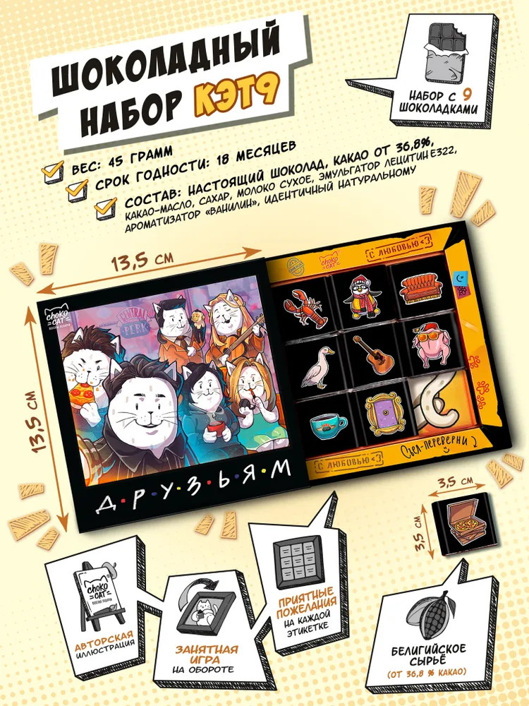 💳 Оплатить за товар можно при получении 🇰🇿 Есть бесплатная доставка по Казахстану от 1 дня 🎁 Копите бонусы с каждой покупки Серия: Кэт 9 Набор для тех, чья поддержка и любовь дороги по-особенному. Внутри 9 молочных шоколадок для посиделок в кругу близких друзей :) Самая продаваемая серия. Набор с 9 молочными шоколадками, где каждая плитка завёрнута в красочную этикетку со своим индивидуальным дизайном и приятным посланием. Формат позволяет уместить больше продукции на полку. На обороте коробочки увлекательная игра. |