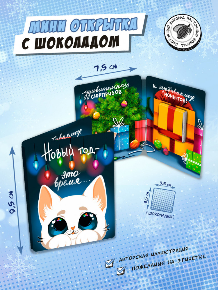 ChokoCat Открытка с шоколадом «Новый год — это время чудес»В данный момент этот товар отсутствует в продаже. Возможно, у нас найдется аналогичный или похожий товар здесь. Серия: Открытки Новый Год — это время чудес. Яркие и незабываемые моменты останутся в памяти навсегда. Мини-открытка — это отличное дополнение для подарка. Способна заменить признание в любви, извинения или просто поднять настроение. Внутри молочный шоколад (5 граммов) в индивидуальной этикетке. |