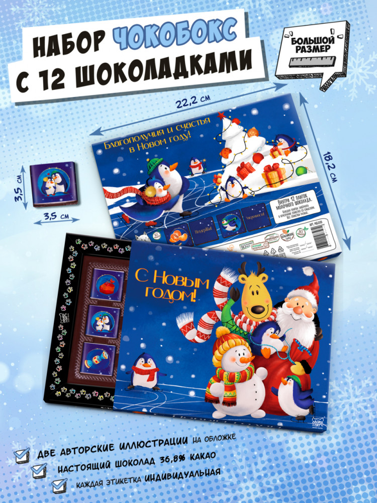 Серия: Чокобокс Набор с 12 плитками молочного шоколада. Новый формат с коррекс-формой для плиток. Каждая из них в индивидуальной этикетке, в наборе все этикетки разные. На обратной стороне набора дизайн дополнен иллюстрацией или текстом в стиле набора. |