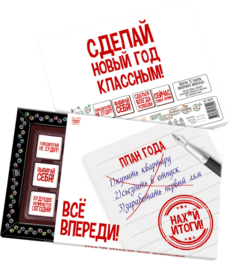 ChokoCat Набор шоколада «Итоги года»В данный момент этот товар отсутствует в продаже. Возможно, у нас найдется аналогичный или похожий товар здесь. Серия: Чокобокс Кто вообще придумал итоги года? Впереди лучшее! Всё впереди! Набор с 12 плитками молочного шоколада. Новый формат с коррекс-формой для плиток. Каждая из них в индивидуальной этикетке, в наборе все этикетки разные. На обратной стороне набора дизайн дополнен иллюстрацией или текстом в стиле набора. |