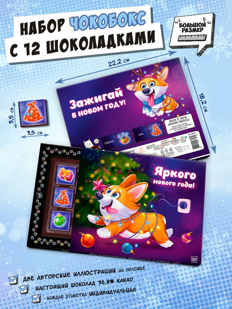 ChokoCat Набор шоколада «Новогодние корги»оформление вкус подарок В данный момент этот товар отсутствует в продаже. Возможно, у нас найдется аналогичный или похожий товар здесь. Серия: Чокобокс Подарок с радостным корги, предвкушающим праздник. Набор с 12 плитками молочного шоколада. Новый формат с коррекс-формой для плиток. Каждая из них в индивидуальной этикетке, в наборе все этикетки разные. На обратной стороне набора дизайн дополнен иллюстрацией или текстом в стиле набора. |