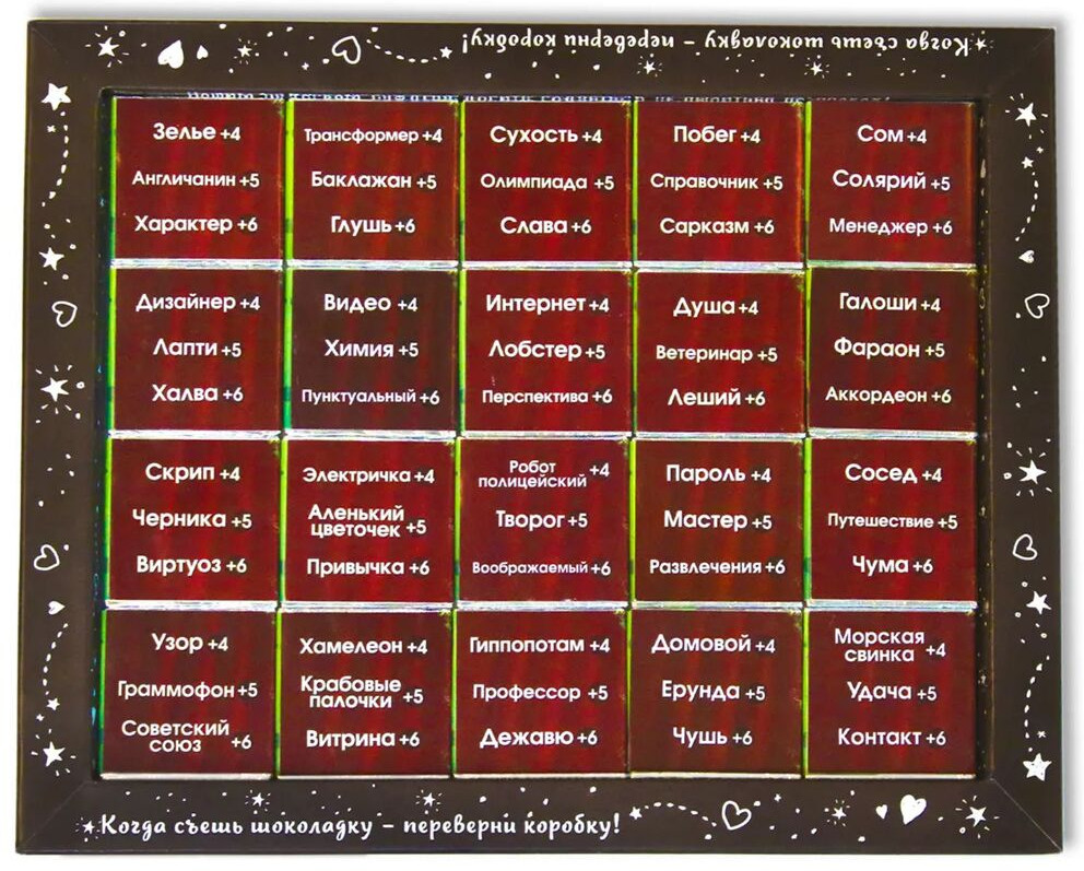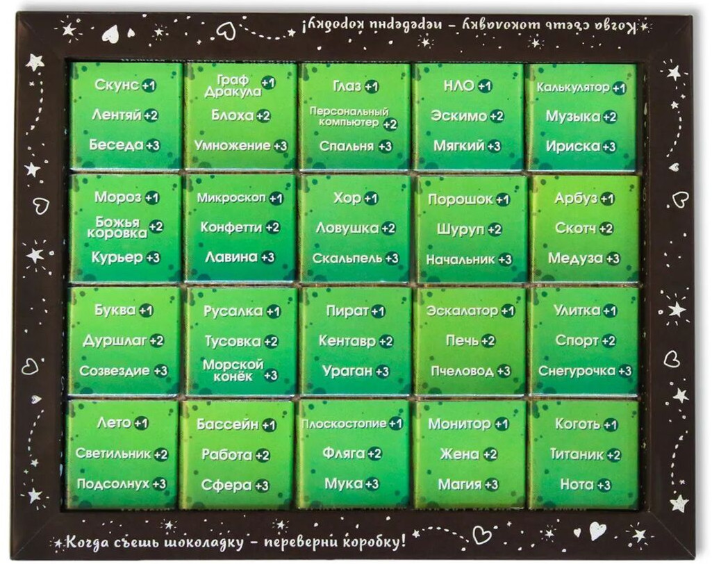 💳 Оплатить за товар можно при получении 🇰🇿 Есть бесплатная доставка по Казахстану от 1 дня 🎁 Копите бонусы с каждой покупки Серия: Шоколадные игры Классический бестселлер настольных игр + наивкуснейший шоколад = прекрасно проведённое время с друзьями. Внутри 20 шоколадок, обёрнутых в этикетки, на каждой из которой по 6 слов. Нужно включить актёрское мастерство и другие таланты, чтобы объяснить жестами слова и забрать шоколадный куш! Шоколадные игры — вкусные приключения, которые сближают! Серия, способная сплотить и объединить людей вокруг себя. 9 увлекательных и захватывающих игр, включая всеми известную классику, которые обязательно создадут приятную дружескую атмосферу в любой компании. |