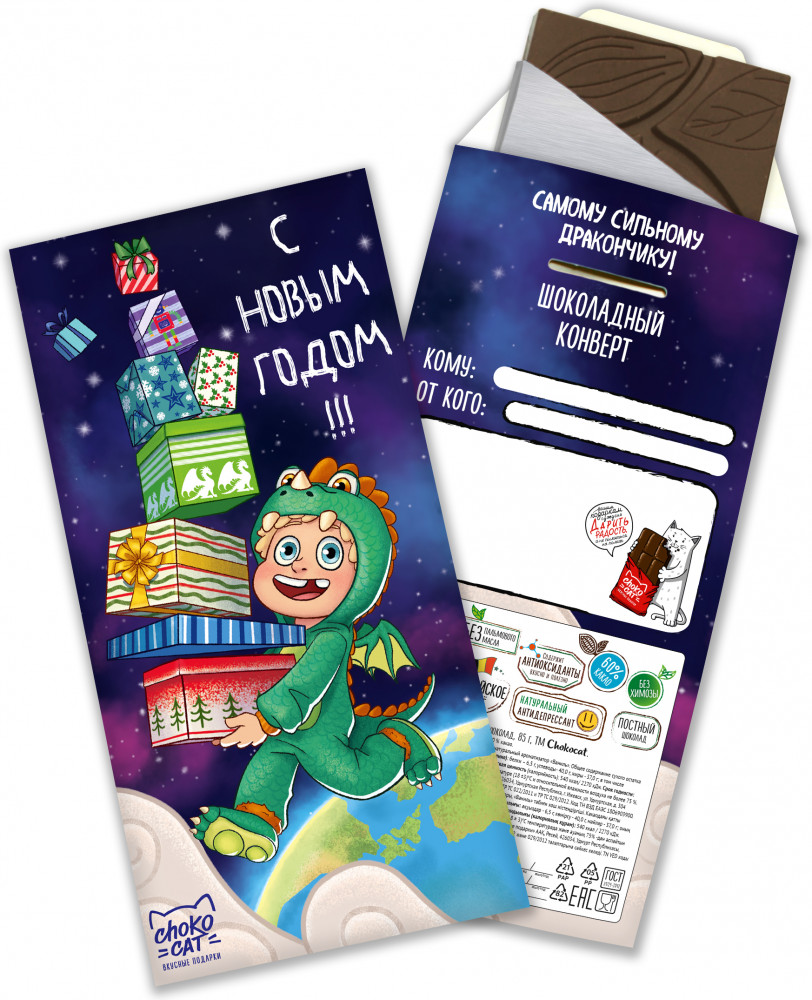 ChokoCat Конверт шоколадный «Мальчик дракон»В данный момент этот товар отсутствует в продаже. Возможно, у нас найдется аналогичный или похожий товар здесь. Уникальный формат! Шоколад без сахара! Обертка — конверт! Открывается сверху и позволяет положить внутрь послание или презент (деньги, сертификат и т.д.). На обратной стороне яркая иллюстрация! |