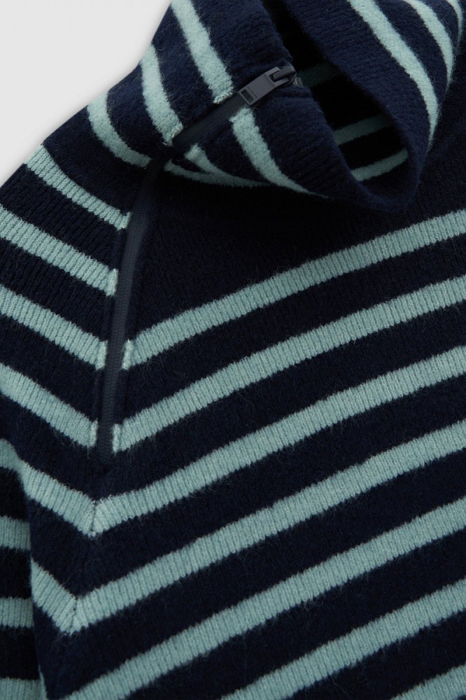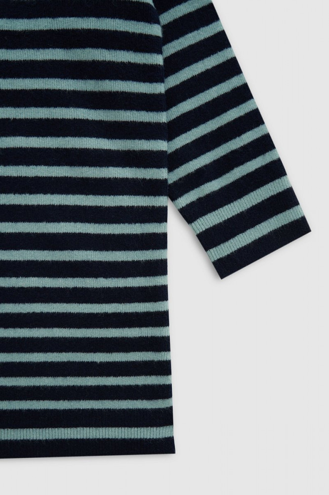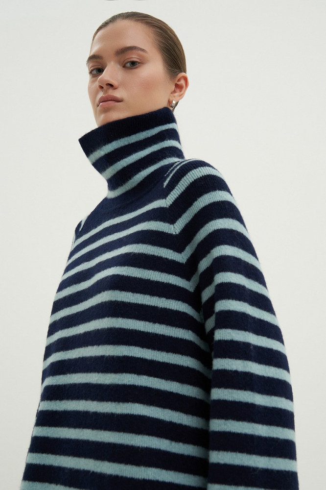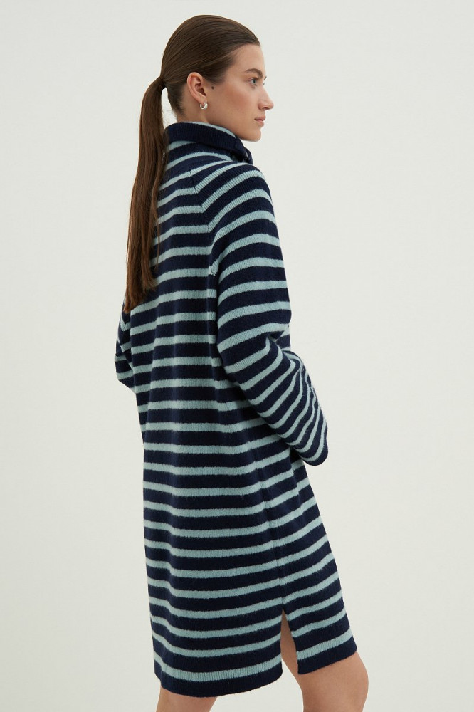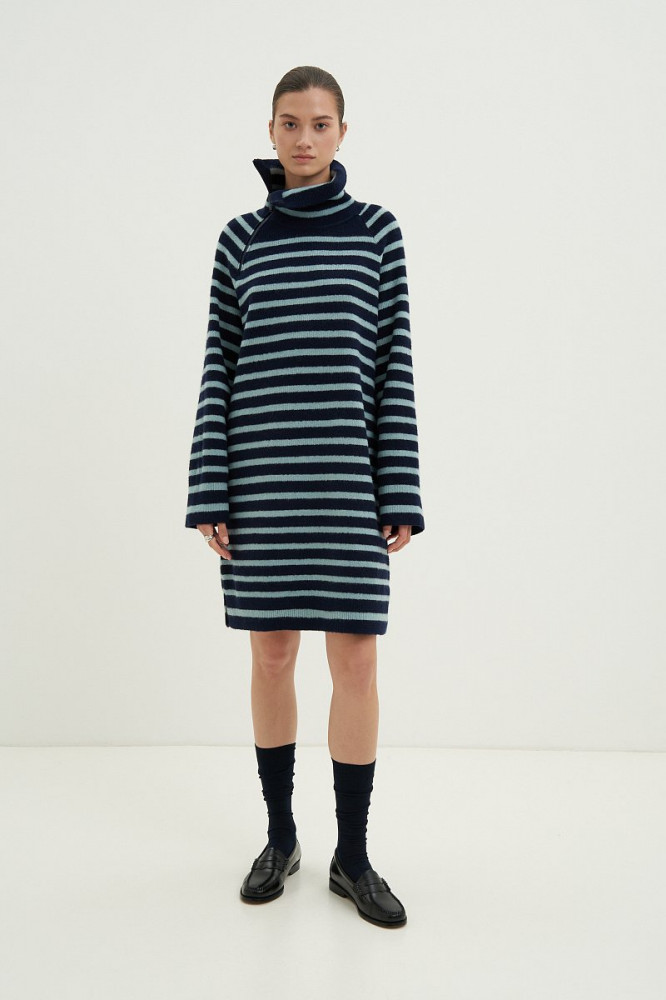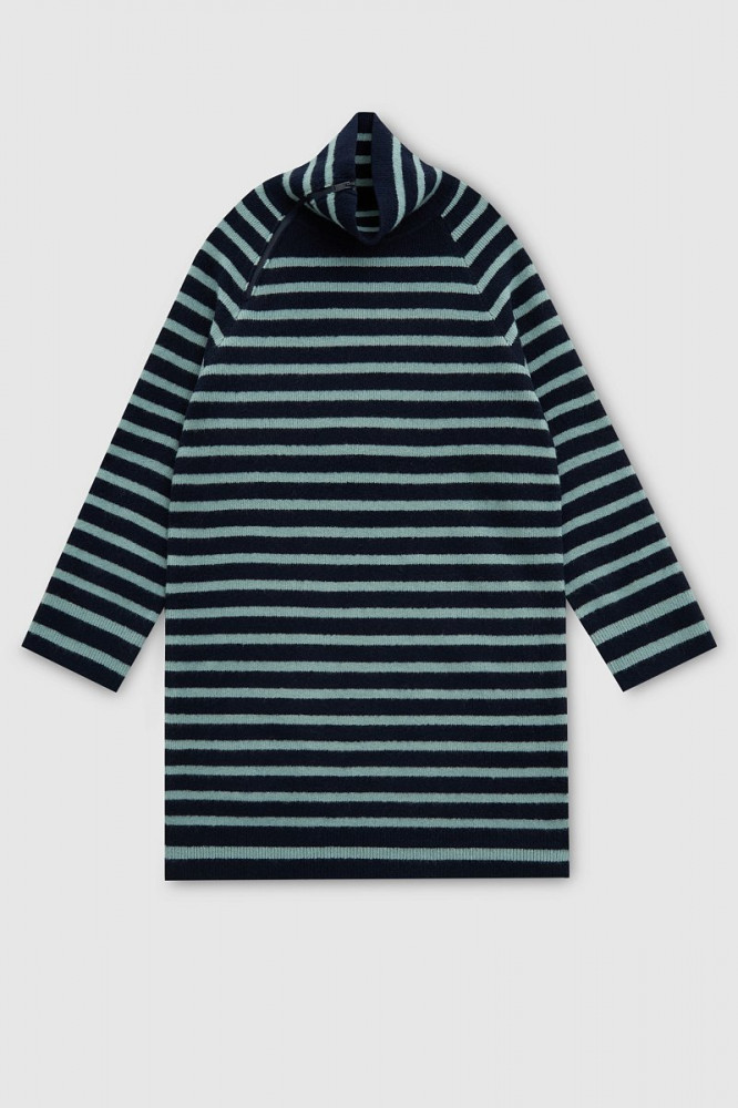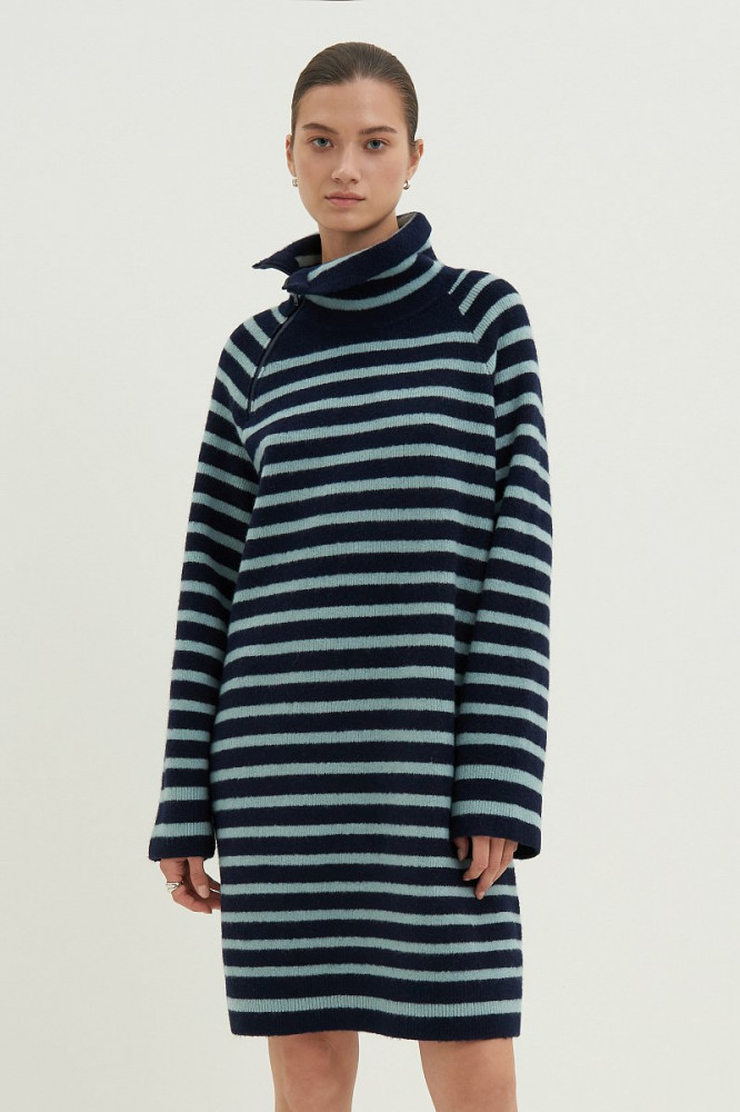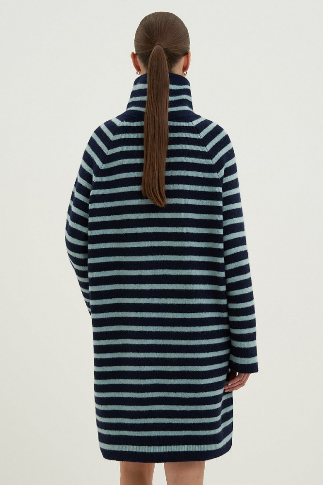 Очень приятное на ощупь, качественный пошив, полоски на переднем и заднем полотнище совпадают. Удобно, что ворот на замке, так как многие вещи не могу носить из- за давящей горловины. Хотелось бы только подлиннее, так как платье на холодное время года, чтобы колени не мерзли. При росте 165 едва доходит до колена.
