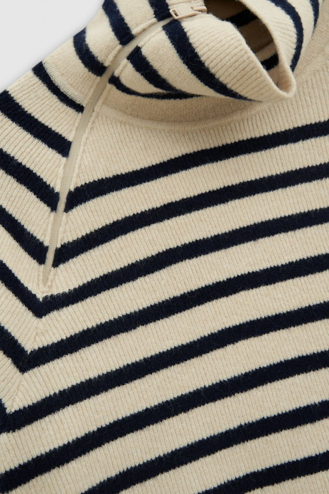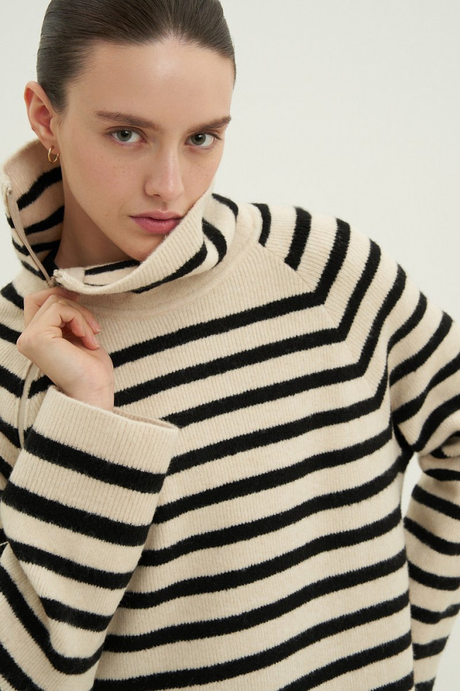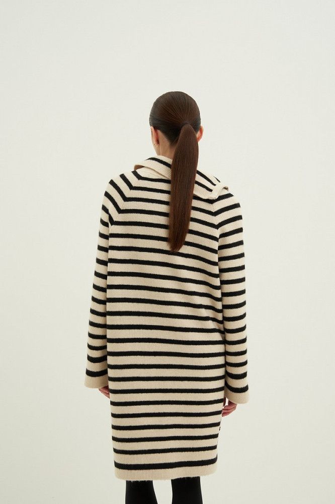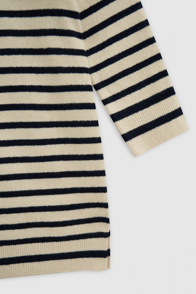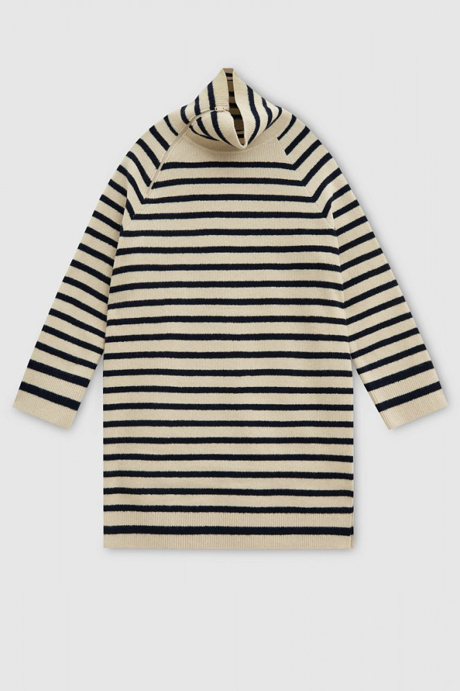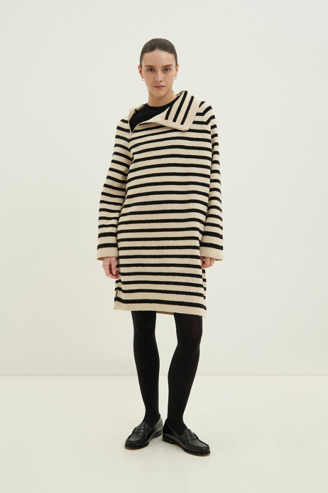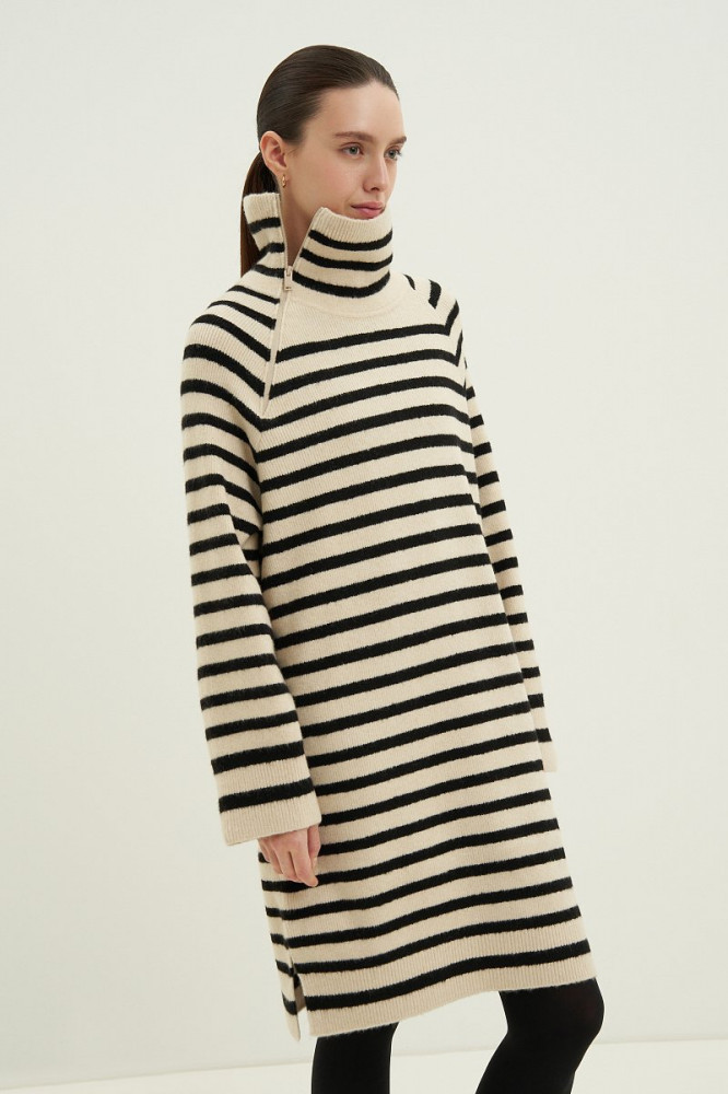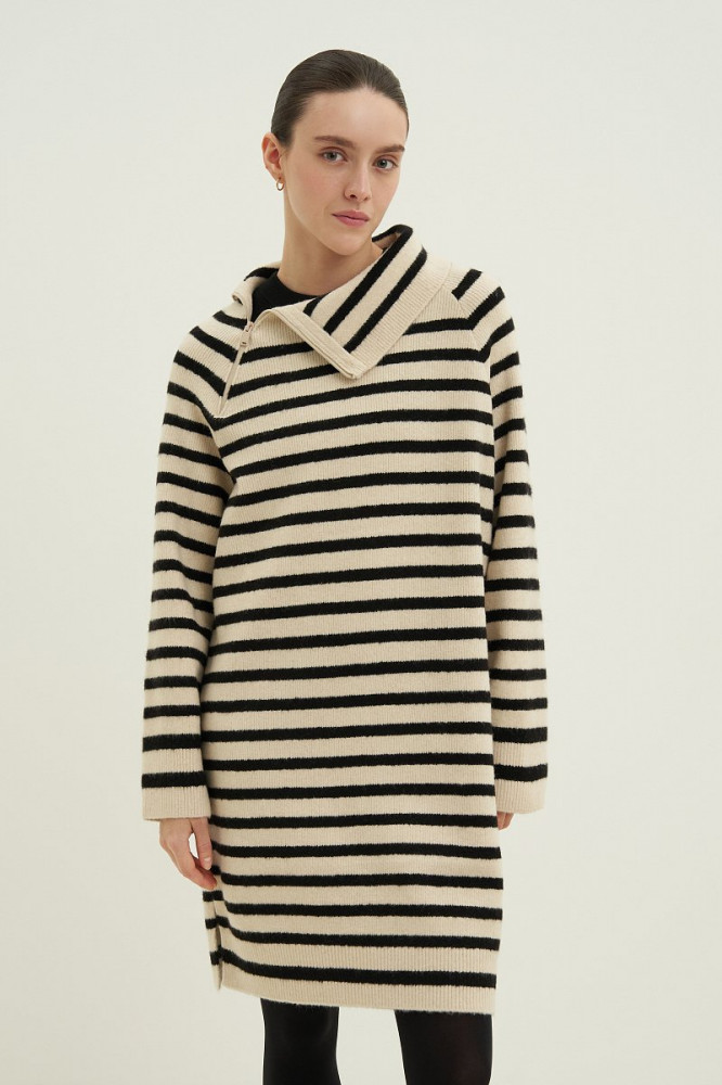Очень приятное на ощупь, качественный пошив, полоски на переднем и заднем полотнище совпадают. Удобно, что ворот на замке, так как многие вещи не могу носить из- за давящей горловины. Хотелось бы только подлиннее, так как платье на холодное время года, чтобы колени не мерзли. При росте 165 едва доходит до колена.