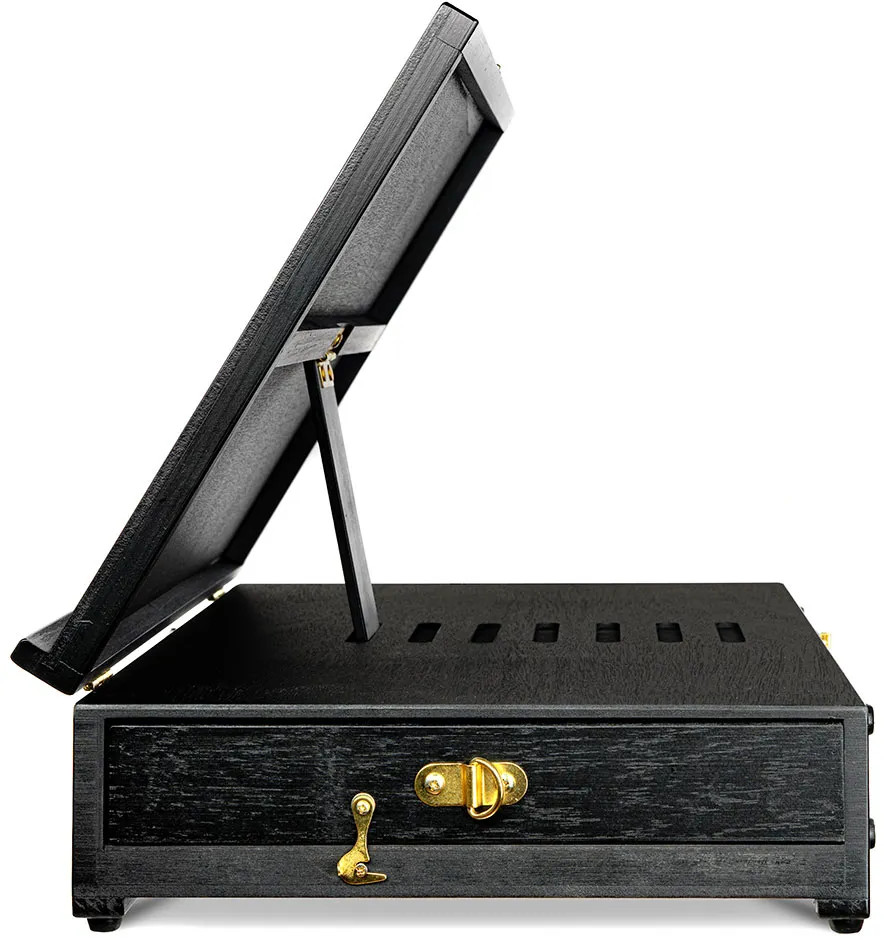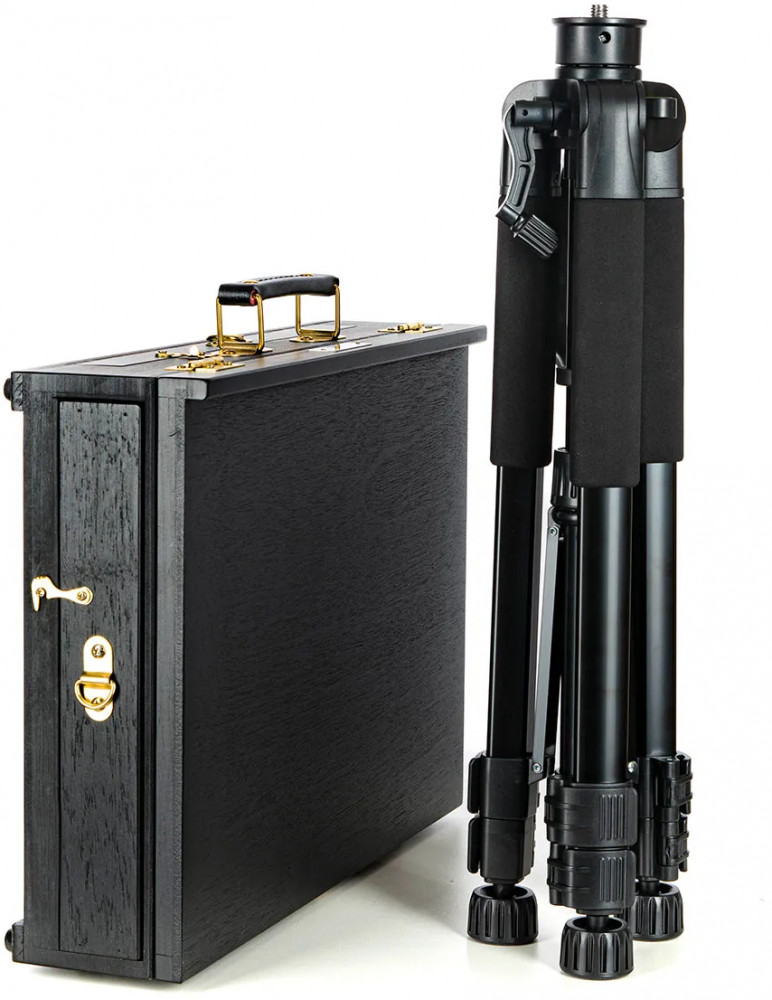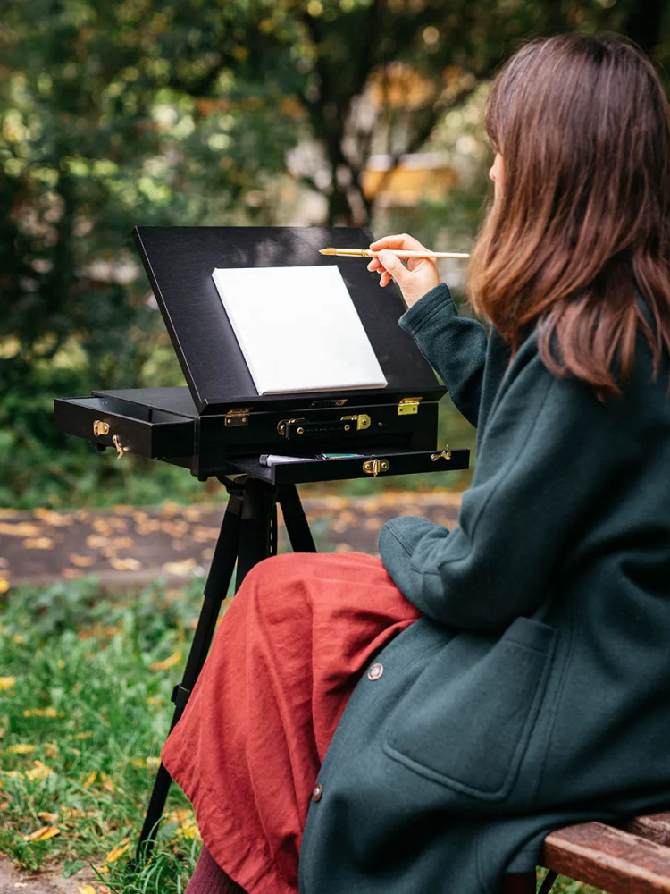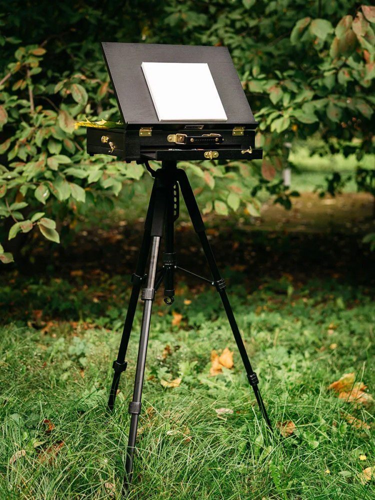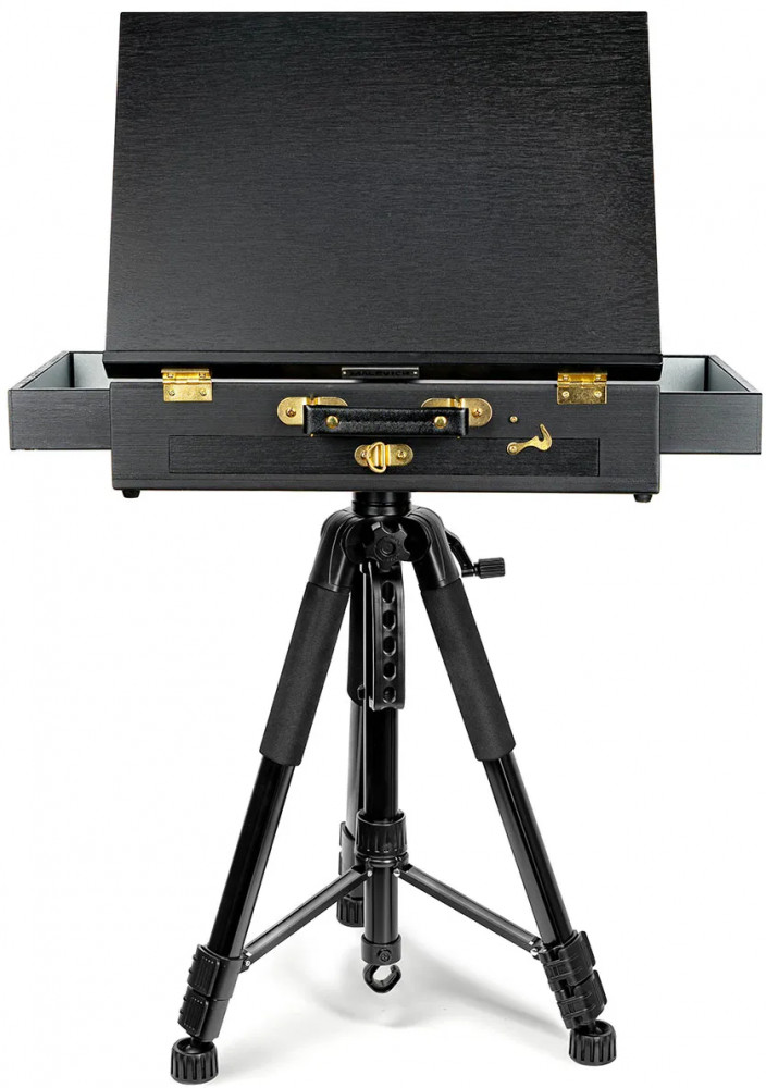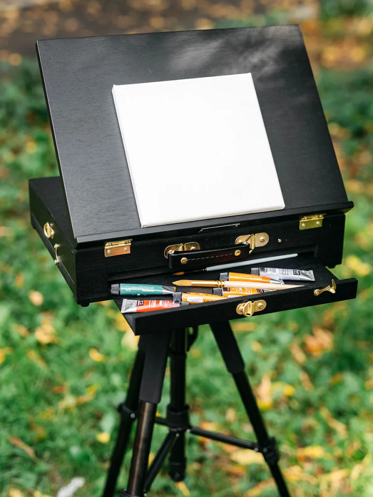 Размер рабочей поверхности — планшета этюдника — А3 (32×42 см). Угол наклона планшета можно менять и установить в шести разных положениях. Для удобства переноски ящик оснащен ручкой из экокожи. Если предпочитается работать стоя, этюдник на треноге станет незаменимым помощником для вас. Небольшой вес (3 кг) позволяет с легкостью передвигаться, выбирая оптимальный ракурс и уровень освещения. Тренога отсоединяется от этюдного ящика и его можно использовать как настольный мольберт. За счет ножек ящик надежно стоит на поверхности и не скользит.