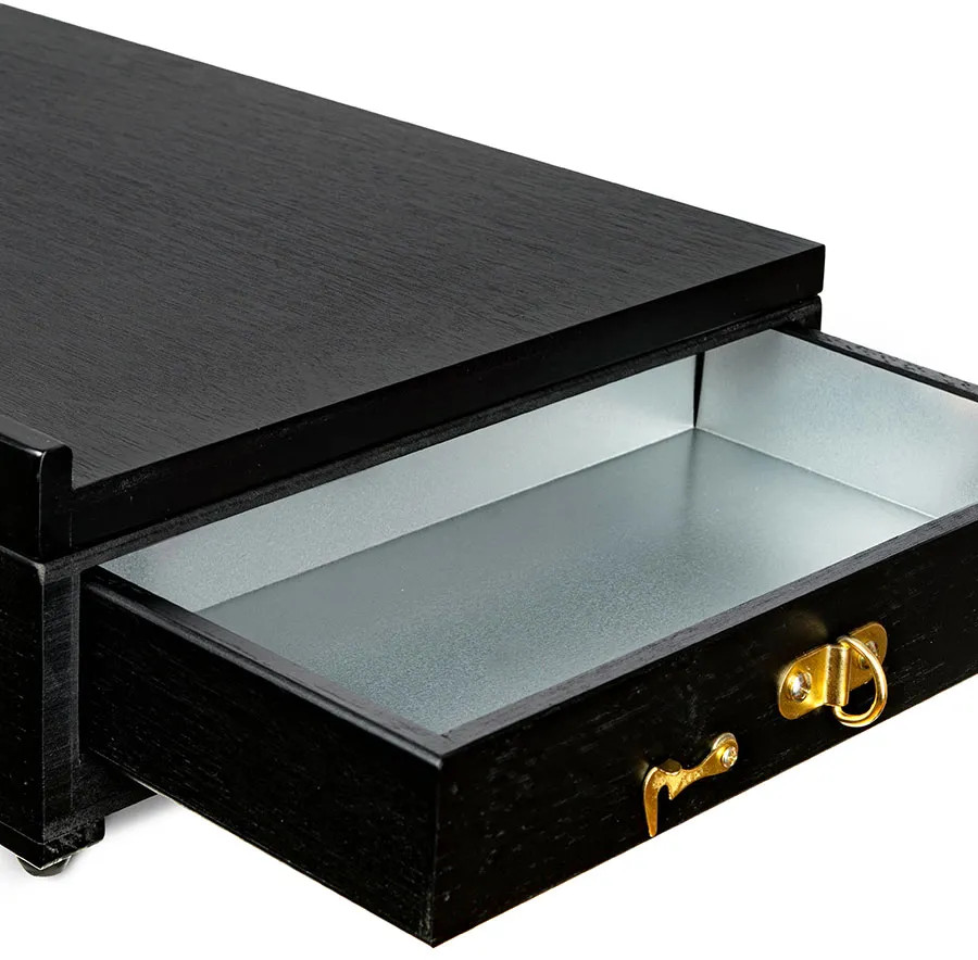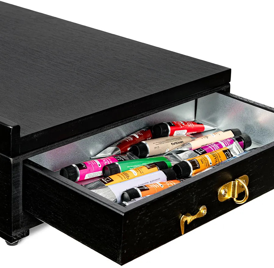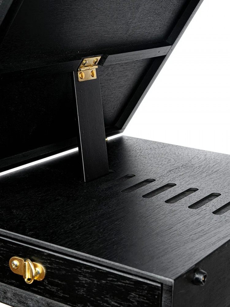 Этюдный ящик оснащен двумя выдвижными полками с алюминиевыми вставками, в которых вы сможете хранить все необходимые материалы для рисования. Здесь есть место для красок, кистей, масленок и других необходимых инструментов для живописи, так что вы всегда будете готовы к творческому процессу без лишних хлопот. Также есть выдвижная вперед полка-подставка, на которой удобно разместить масленку, краски, пастель, кисти и другие материалы, необходимые для работы и быстрого доступа.