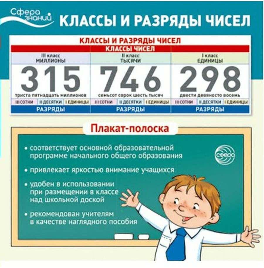 💳 Оплатить за товар можно при получении 🇰🇿 Есть бесплатная доставка по Казахстану от 1 дня 🎁 Копите бонусы с каждой покупки Серия: Сфера знаний Плакат-полоска «Классы и разряды чисел» поможет учащимся наглядно представить систему классов и разрядов чисел, выучить и запомнить их структуру и классификацию, даст детям возможность представлять многозначное число по разрядам и упростит математические операции с ними. Учащиеся разовьют математическое мышление, логику и память. |