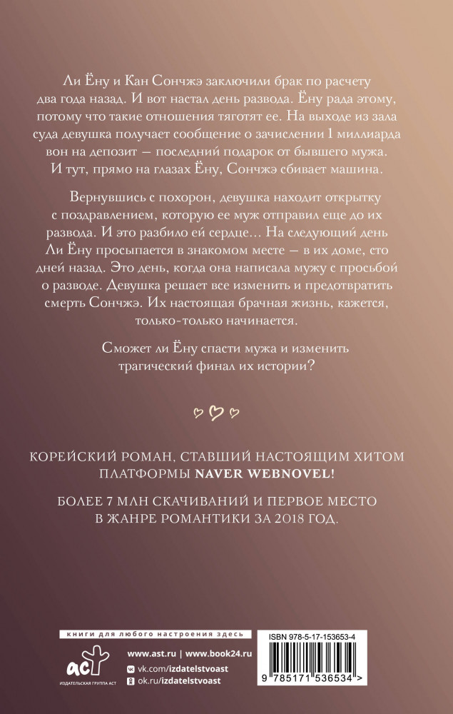 💳 Оплатить за товар можно при получении 🇰🇿 Есть бесплатная доставка по Казахстану от 1 дня 🎁 Копите бонусы с каждой покупки Серия: Like Дорама. Романтика Ли Ёну и Кан Сончжэ заключили брак по расчету два года назад. И вот настал день развода. Ёну рада этому, потому что такие отношения тяготят ее. На выходе из зала суда девушка получает сообщение о зачислении 1 миллиарда вон на депозит — последний подарок от бывшего мужа. |