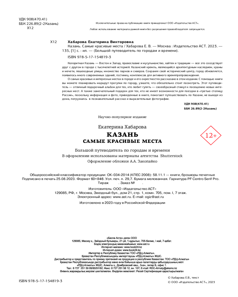 💳 Оплатить за товар можно при получении 🇰🇿 Есть бесплатная доставка по Казахстану от 1 дня 🎁 Копите бонусы с каждой покупки Серия: Большой путеводитель по городам и времени Колоритная Казань — Восток и Запад, православие и мусульманство, хайтек и традиции — все это соседствует друг с другом в городе с тысячелетней историей. Казанский кремль, являющийся архитектурным наследием, храмы и мечети, пешеходные улицы, множество парков и скверов. Сохраняя свой исторический центр, город обновляется, появилось много современных зданий, гостиниц, комплексов для активного времяпрепровождения. |