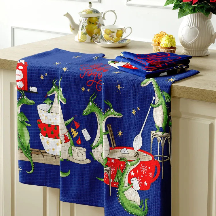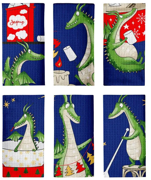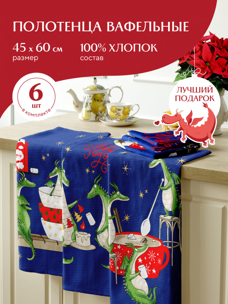 неравномерное распределение по рисункам: 3 шт - с елочными украшениями, 1 шт с зефиром, 2 с красн чашей. хотя на фото представлено, что всех видов по 2 шт. взяли 2 набора - оба оказались с подобным браком. размеры полотенец также чуть отличаются, какие-то шире, какие-то уже.