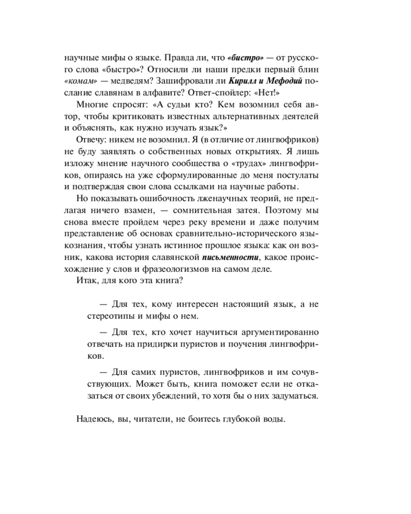 Интересно написана книга, уже почти половину «проглотила». Легкий слог, удобный для чтения шрифт, хорошая печать. Рекомендую всем интересующимся развитием русского языка, а так как интересную научпоп книгу о языке.