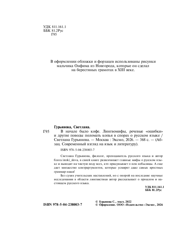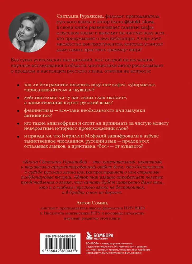 💳 Оплатить за товар можно при получении 🇰🇿 Есть бесплатная доставка по Казахстану от 1 дня 🎁 Копите бонусы с каждой покупки Серия: Абзац. Современный взгляд на язык и литературу Светлана Гурьянова, филолог, преподаватель русского языка и автор блога istoki_slova, в своей книге развенчивает главные мифы о русском языке и выводит на чистую воду всех, кто придумывает о нем небылицы. А еще дает множество контраргументов, которые усмирят даже самых яростных граммар-наци! |