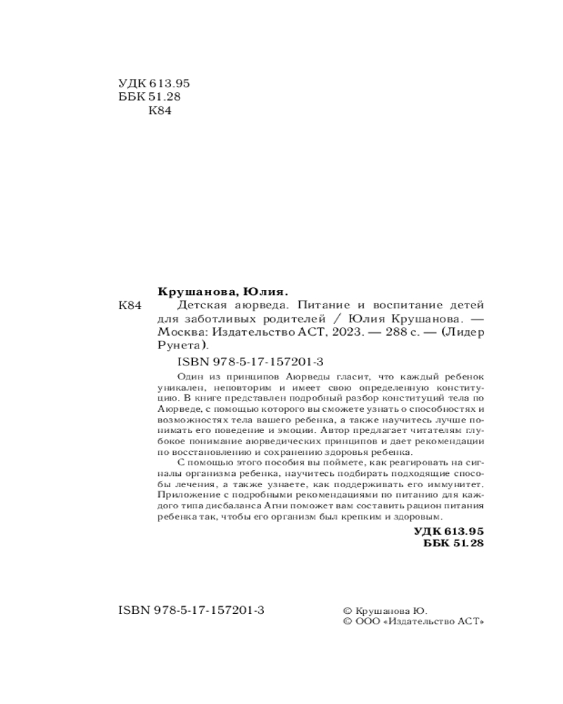 💳 Оплатить за товар можно при получении 🇰🇿 Есть бесплатная доставка по Казахстану от 1 дня 🎁 Копите бонусы с каждой покупки Серия: Лидер Рунета Один из принципов Аюрведы гласит, что каждый ребенок уникален, неповторим и имеет свою определенную конституцию. В книге представлен подробный разбор конституций тела по Аюрведе, с помощью которого вы сможете узнать о способностях и возможностях тела вашего ребенка, а также научитесь лучше понимать его поведение и эмоции. Автор предлагает читателям глубокое понимание аюрведических принципов и дает рекомендации по восстановлению и сохранению здоровья ребенка. |
