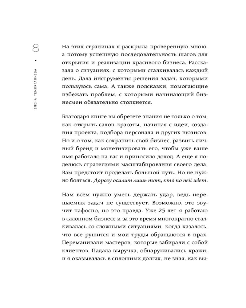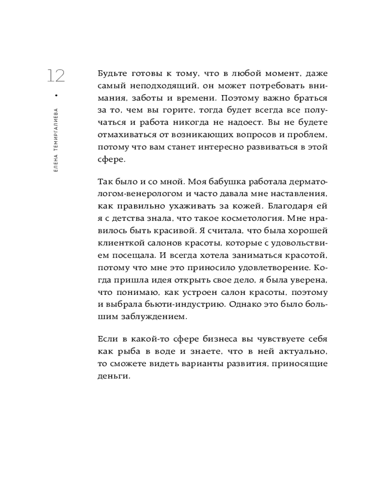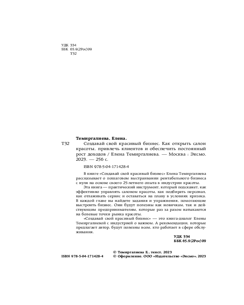 Создавай свой красивый бизнес. Как открыть салон красоты, привлечь клиентов и обеспечить постоянный рост доходовВ данный момент этот товар отсутствует в продаже. Возможно, у нас найдется аналогичный или похожий товар здесь. Серия: Бизнес. Как это работает в России В книге «Создавай свой красивый бизнес» Елена Темиргалиева рассказывает о пошаговом выстраивании рентабельного бизнеса с нуля на основе своего 25-летнего опыта в индустрии красоты. Эта книга — практический инструмент, который подскажет, как эффективно управлять салоном красоты, как подбирать персонал, как отлаживать сервис и оставаться на плаву в условиях кризиса. В каждой главе вы найдете задания и упражнения, помогающие выстроить бизнес. Они будут полезны как новичкам, так и действующим предпринимателям, которые раз за разом натыкаются на болевые точки рынка красоты. |
