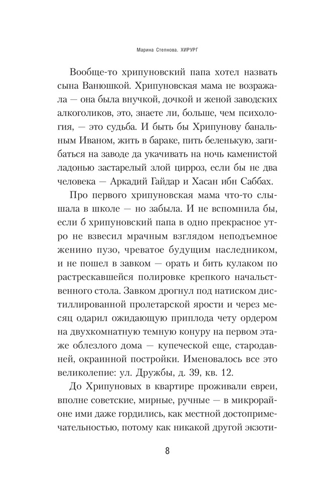 ХирургВ данный момент этот товар отсутствует в продаже. Возможно, у нас найдется аналогичный или похожий товар здесь. В романе «Хирург» история гениального пластического хирурга Аркадия Хрипунова переплетена с рассказом о жизни Хасана ибн Саббаха — пророка и основателя государства |