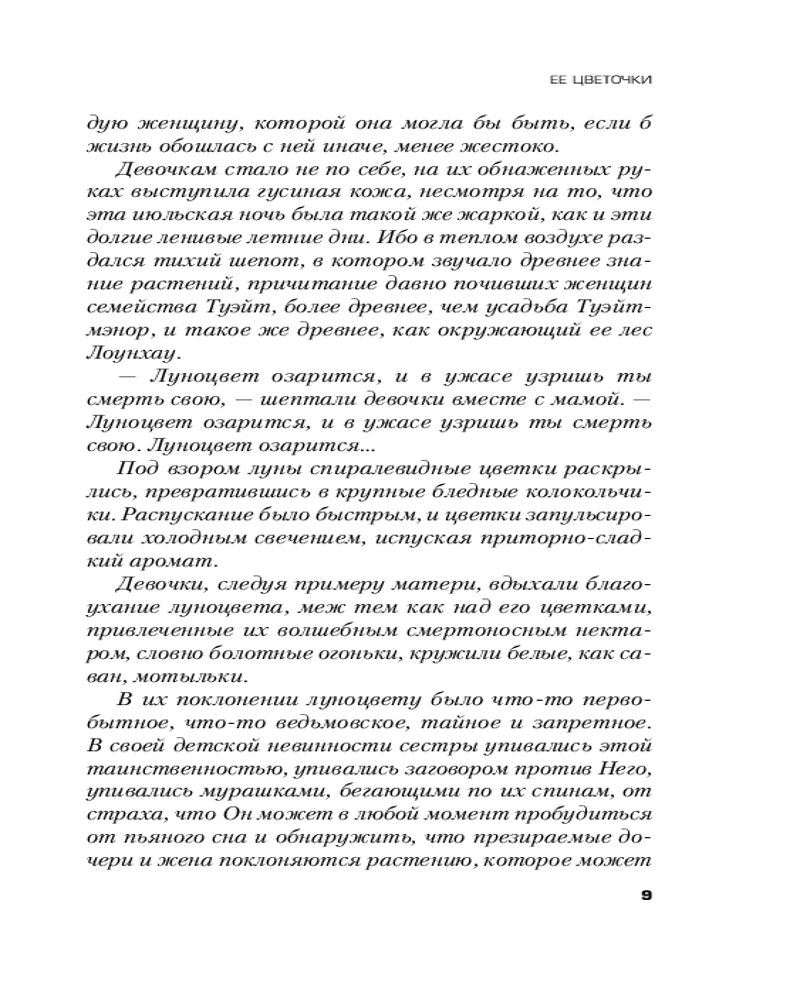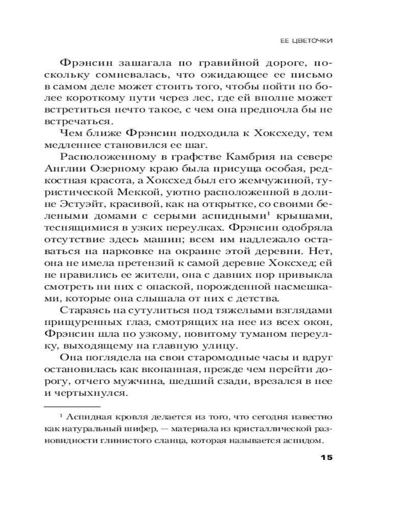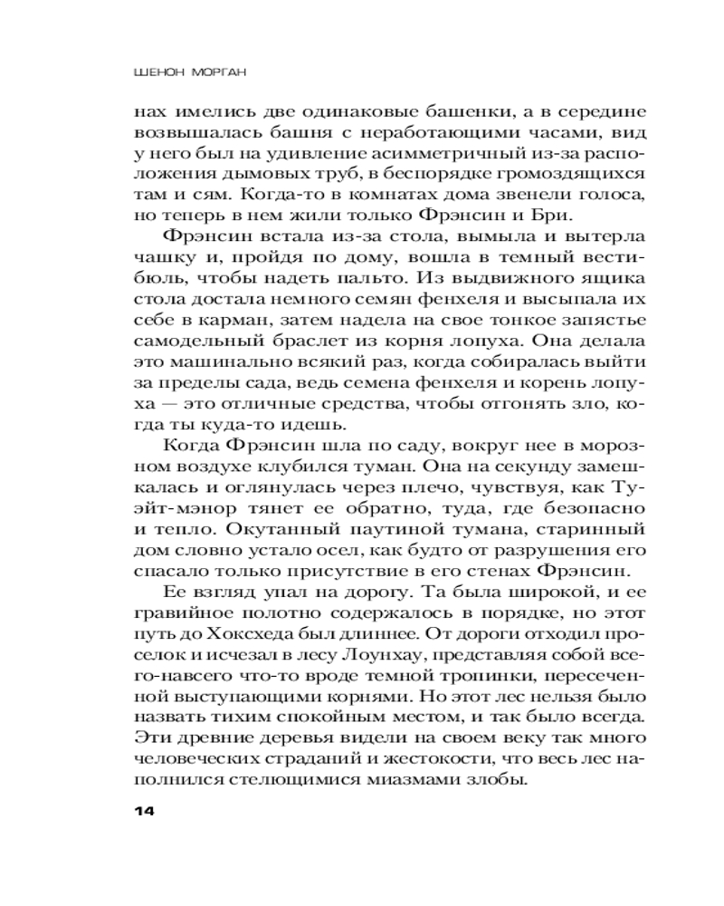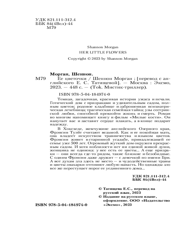 💳 Оплатить за товар можно при получении 🇰🇿 Есть бесплатная доставка по Казахстану от 1 дня 🎁 Копите бонусы с каждой покупки Серия: Tok. Мистик-триллер В Хоксхеде, жемчужине английского Озерного края, Фрэнсин Туэйт считают ведьмой. Как и ее покойная мать, она владеет искусством травничества и Языком цветов. Фрэнсин живет в старинной усадьбе, принадлежащей ее семье уже 500 лет. Огромный жуткий дом окружен прекрасным садом. И хотя поблизости нет ни единой живой души, женщина не одинока: у нее есть ее цветы... А еще призраки — они всегда где-то рядом, такие близкие и безобидные. С одним Фрэнсин даже дружит — с девочкой по имени Бри. А вот духам зла здесь не место — и чудодейственные травы и цветы знахарки отгоняют любую напасть. Но однажды зло все же переступает порог ее уединенного дома... |