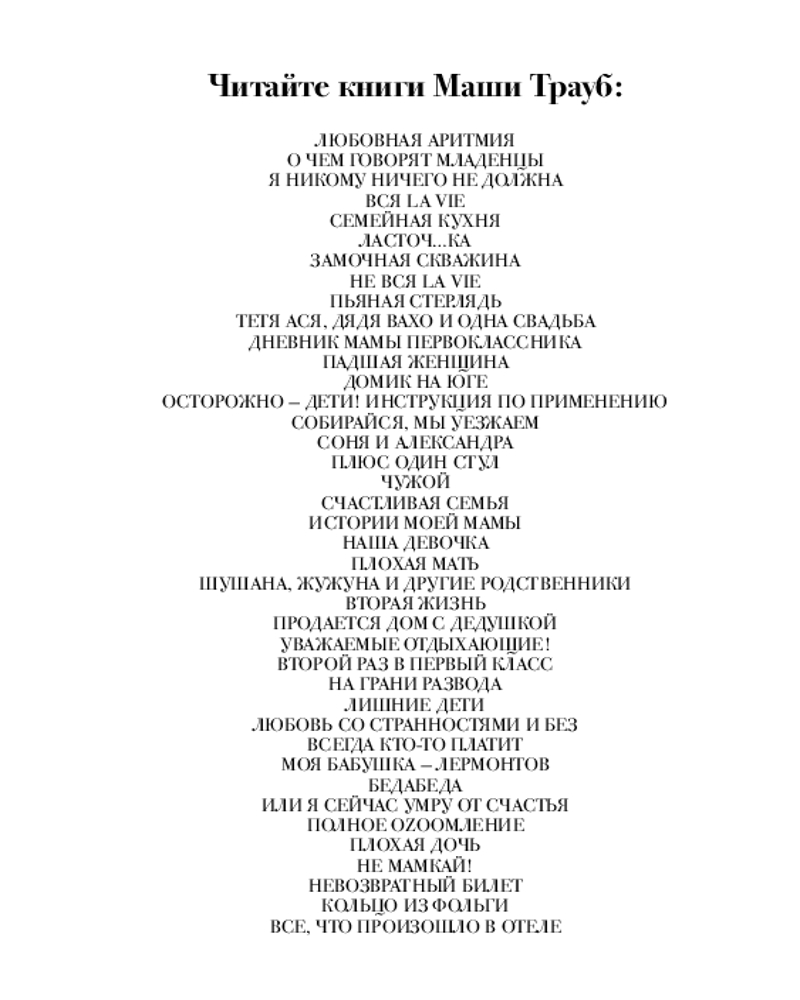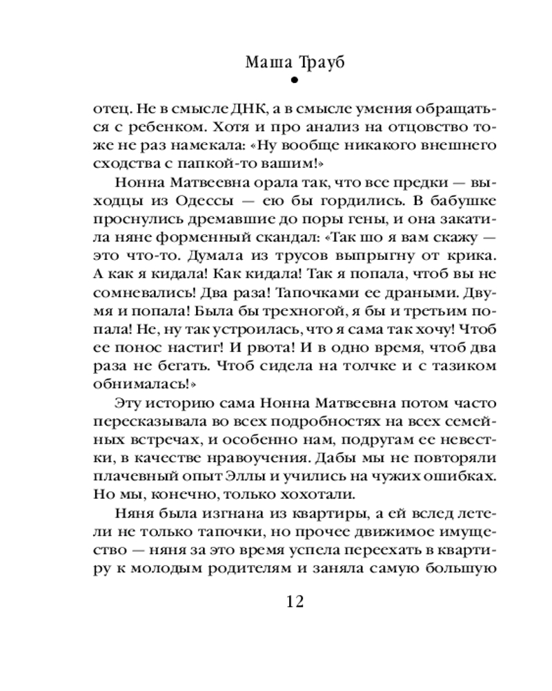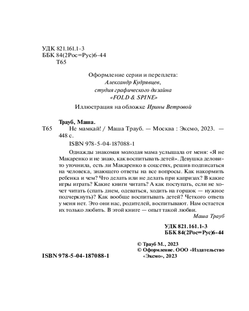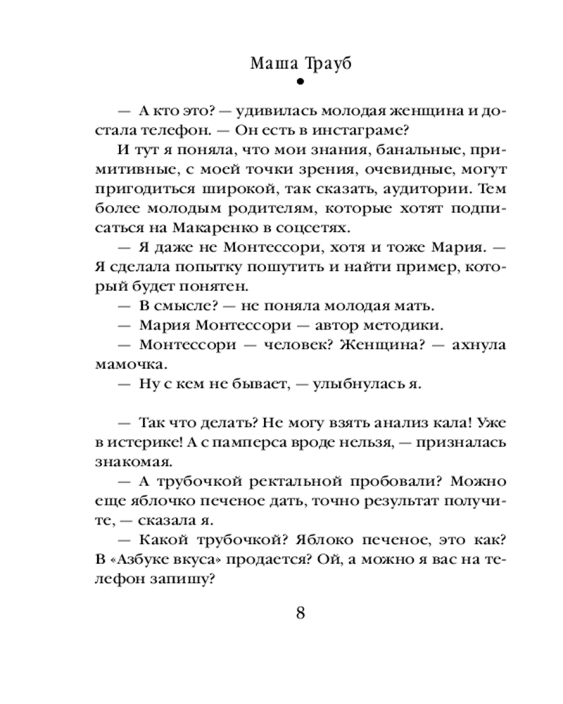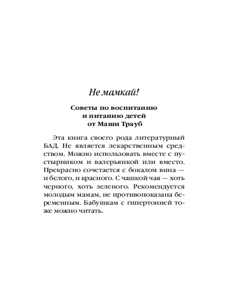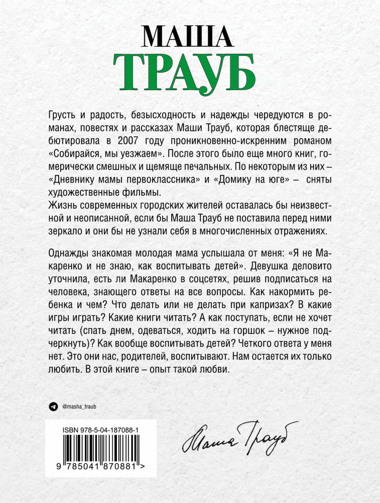 💳 Оплатить за товар можно при получении 🇰🇿 Есть бесплатная доставка по Казахстану от 1 дня 🎁 Копите бонусы с каждой покупки Серия: Проза Маши Трауб. Жизнь как в зеркале (обложка) От Спока до Макаренко. Этот путь прошли все родители старшего поколения. Нынешние искренне считают, что на Макаренко можно подписаться в социальных сетях. Маша Трауб решила помочь тем, кто сомневается в своих родительских способностях, и собрала весь свой солидный родительский опыт в этой книге. А поскольку она не только мать двоих детей, но и колумнист, писатель и журналист, то получилось весело и живо. Эта книга — инструкция по пользованию детьми от 0 и до старшего школьного возраста. Все как в жизни — сначала чем кормить и лечить, потом — как учить, терпеть, не раздражаться. Не удивляться. И — любить. |