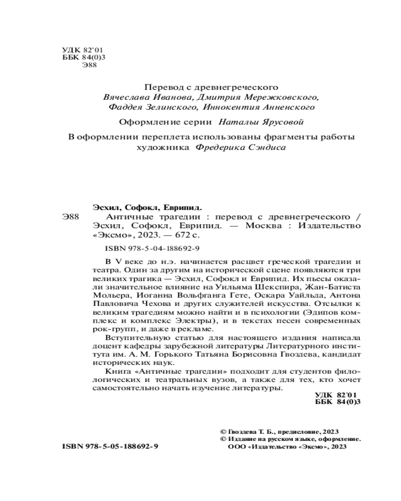 💳 Оплатить за товар можно при получении 🇰🇿 Есть бесплатная доставка по Казахстану от 1 дня 🎁 Копите бонусы с каждой покупки Серия: Всемирная литература (новое оформление) В V веке до н.э. начинается расцвет греческой трагедии и театра. Один за другим на исторической сцене появляются три великих трагика — Эсхил, Софокл и Еврипид. Их пьесы оказали значительное влияние на Уильяма Шекспира, Жана-Батиста Мольера, Иоганна Вольфганга Гете, Оскара Уайльда, Антона Павловича Чехова и на других служителей искусства. Отсылки к великим трагедиям можно найти и в психологии (Эдипов комплекс и комплекс Электры), и в текстах песен современных рок-групп, и даже в рекламе. |