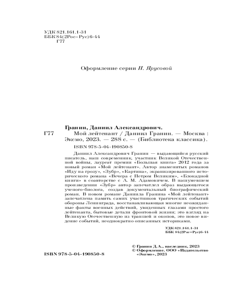 💳 Оплатить за товар можно при получении 🇰🇿 Есть бесплатная доставка по Казахстану 🎁 Копите бонусы с каждой покупки Серия: Библиотека классика Даниил Александрович Гранин — выдающийся русский писатель, наш современник, участник Великой Отечественной войны, лауреат премии «Большая книга» 2012 года за новый роман «Мой лейтенант». Автор знаменитых романов «Иду на грозу», «Зубр», «Картина», экранизированного исторического романа «Вечера с Петром Великим», «Блокадной книги» в соавторстве с А.М. Адамовичем. В нашумевшем произведении «Зубр» автор запечатлел образ выдающегося ученого-биолога, создав документальный биографический роман. В новом романе Даниила Гранина «Мой лейтенант» запечатлена память самих участников трагических событий обороны Ленинграда, восстанавливающая многие неожиданные факты военных действий, увиденных глазами простого лейтенанта, бытовые детали фронтовой жизни; это взгляд на Великую Отечественную из траншей и окопов, это новое видение событий, неоднократно описанных историками. |