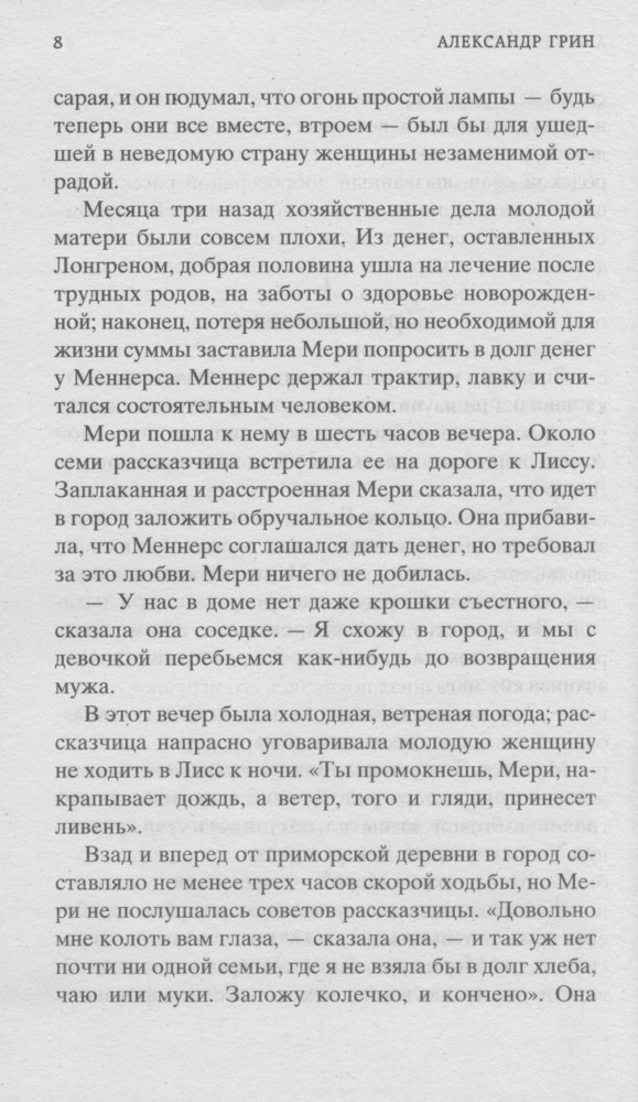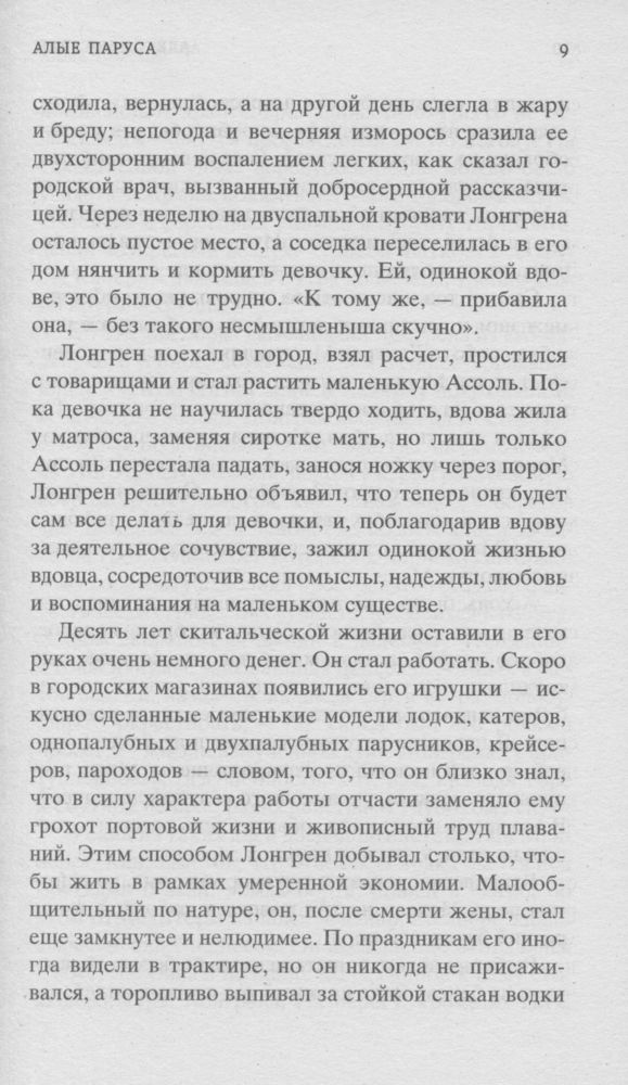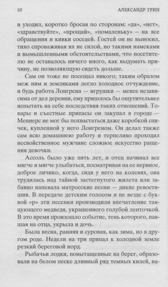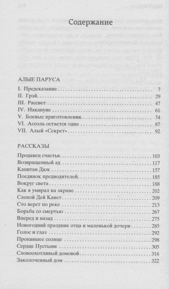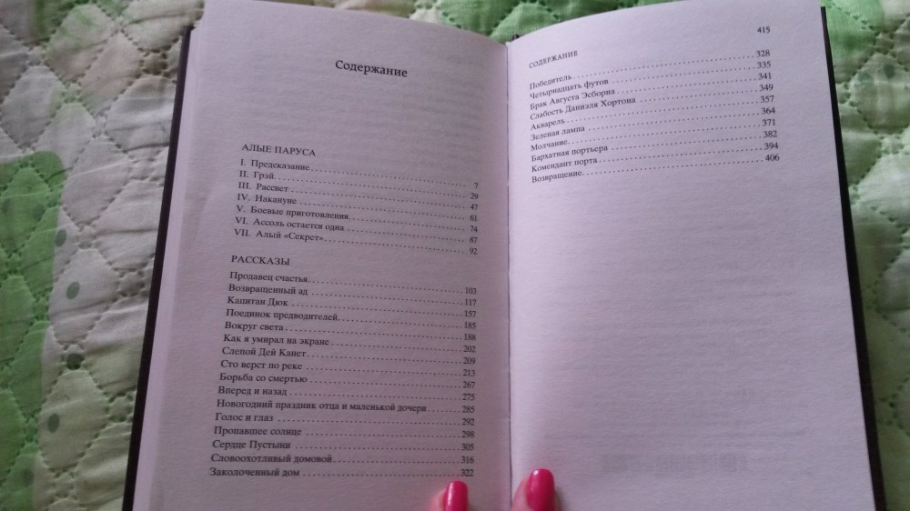Книга замечательна! Если честно за данную цену ожидаешь подвоха, но его здесь нет. Само издание прекрасное. Переплет твердый, выглядит минималлистично, но стильно, лично мне по вкусу. На полке смотрится так же великолепно. Корешок позволяет поставить книгу и вертикально и горизонтально, выглядит и так и так прекрасно. Сам сюжет. Алые паруса занимает всего сто страниц, на остальных много разных рассказов. Сам роман оставил в полном восторге. Мне тринадцать лет и это мой первый любовный роман, раньше как-то не тянуло. Там все было прописано до малейших подробностей. У меня было чувство, будто я сама вижу и переживаю все это, настолько здесь все подробно описано. Каждая, даже малейшая деталь, тут не оставлена без внимания и так подробно описаны кстати абсолютно все рассказы. Рассказы тоже довольно хорошие, многие на любителя. Но почти во всех рассказах у меня случалось что мне он не нравился, было скучно, но в конце ты понимаешь суть и это просто прекрасно, настолько здесь мудрые рассказы. Жаль что нет здесь Бегущей по волнам и в отдельном издание я ее так и не нашла, так что придется читать с телефона. Единственный минус, золотая краска сильно сошла как с букв названия так и с узора. Но что самое интересное у моих друзей и у других книг этого издания нет такой проблемы, решается обложкой.