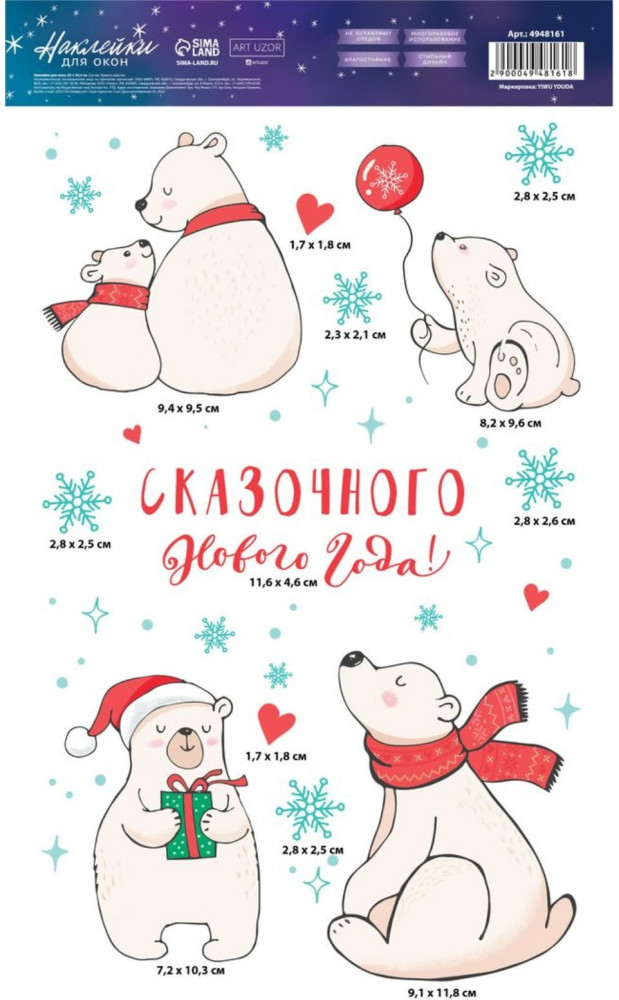 Арт Узор Набор наклеек на окно многоразовых «Новогодние мишки»-40% +5