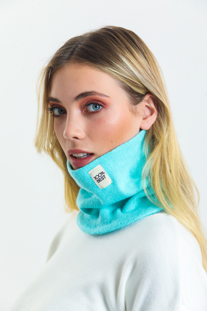 Снуд красивой яркой синей расцветки. Особенно удобен для защиты лица в сильные морозы. Заказала второй пудровой расцветки.