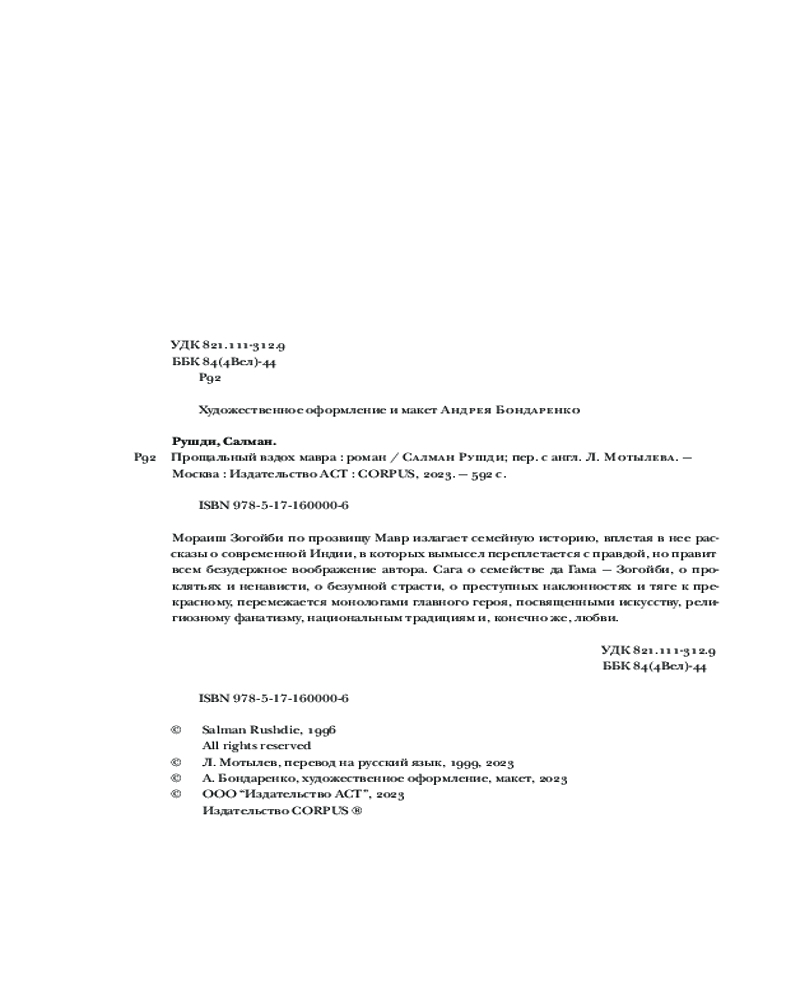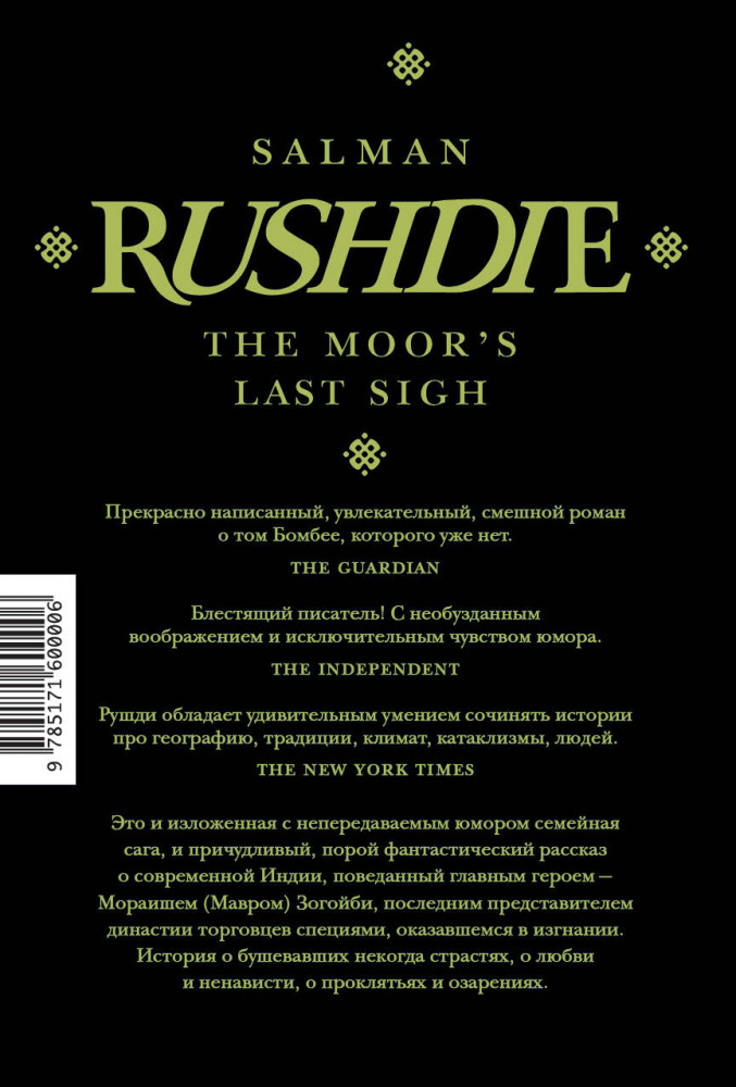 💳 Оплатить за товар можно при получении 🇰🇿 Есть бесплатная доставка по Казахстану от 1 дня 🎁 Копите бонусы с каждой покупки Серия: Весь Салман Рушди Мораиш Зогойби по прозвищу Мавр излагает семейную историю, вплетая в нее рассказы о современной Индии, в которых вымысел переплетается с правдой, но правит всем безудержное воображение автора. Сага о семействе да Гама — Зогойби, о проклятьях и ненависти, о безумной страсти, о преступных наклонностях и тяге к прекрасному, перемежается монологами главного героя, посвященными искусству, национальным традициям и, конечно же, любви. |
